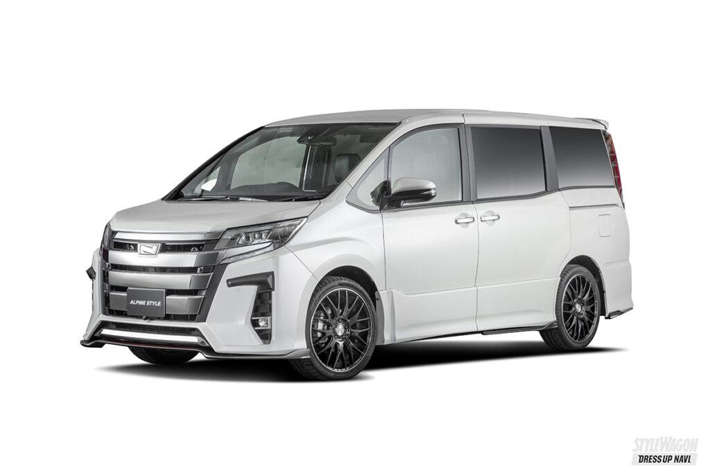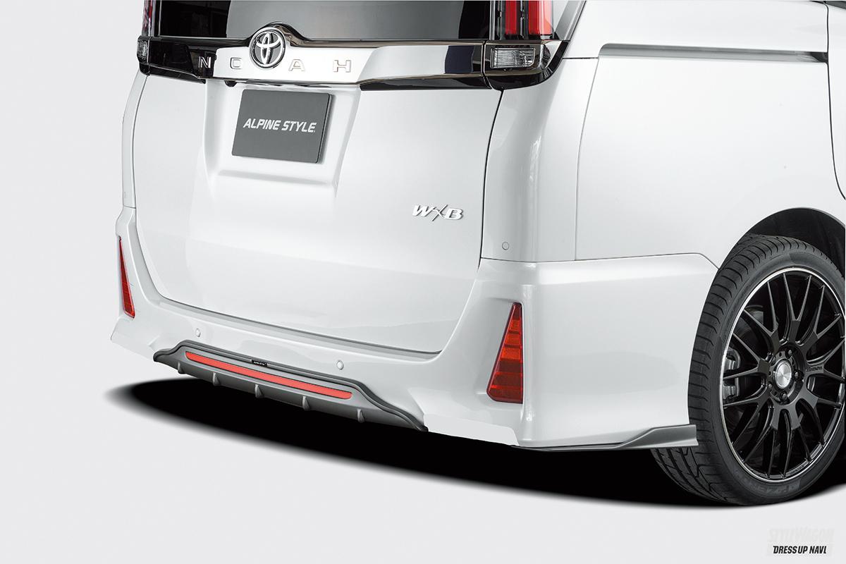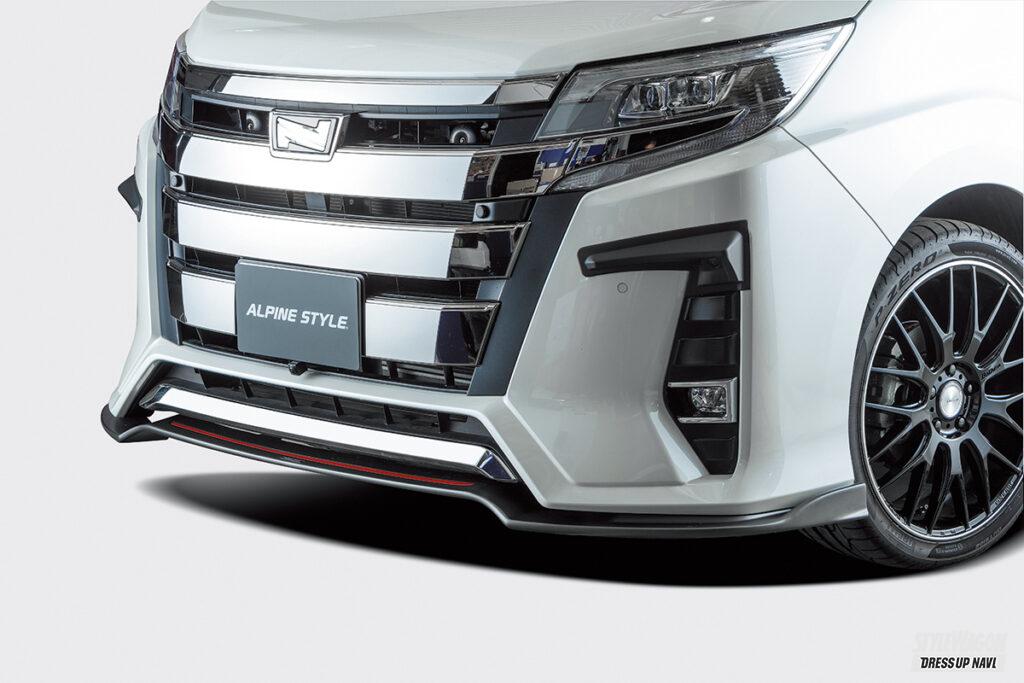 ヴォクシーでも話題となっているフラップタイプは、欲しい場所に、欲しい大きさで提案するミニマムカスタムスタイル。フロントとサイド、リア側面はフラップで、リア中央はディフューザーと、エアロカスタムの入門エアロとしても最適なお手軽さが魅力だ。サイドとリアはヴォクシー共通となっており、フロントのみノア専用となる。