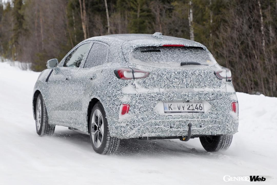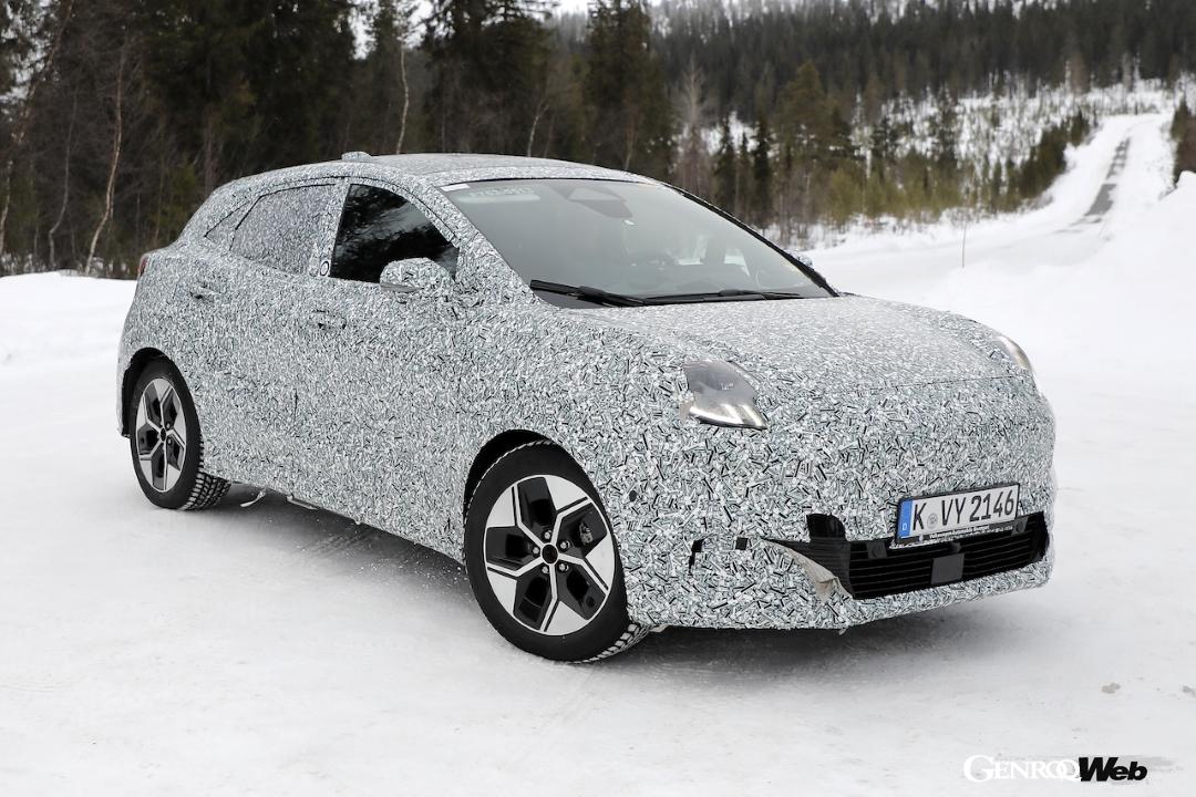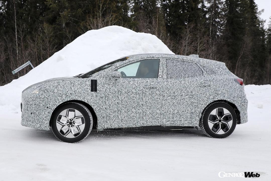 プーマEVのヘッドライトには、ICEバージョンに採用された新しいグラフィックが採用されていることがわかる。一方、ノーズセクションはエンジン搭載モデルとは若干異なっているようだ。プロトタイプの大部分はカモフラージュで隠されているが、グリル面が平坦になっていることや、バンパー下部に細かい水平バーが設けられているのが確認できる。これは、ICEとは違う冷却要件によるものと思われる。
