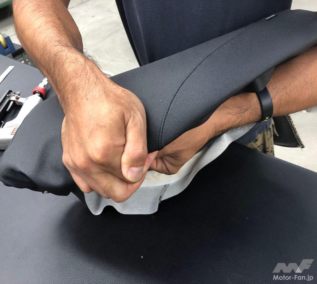 純正シート風を狙って選んだ黒の表皮の出来栄えは素晴らしく、ゲルが埋め込まれている部分も、じ〜っくりと見ないとよくわからないほどナチュラルな仕上がりはさすが職人技です。