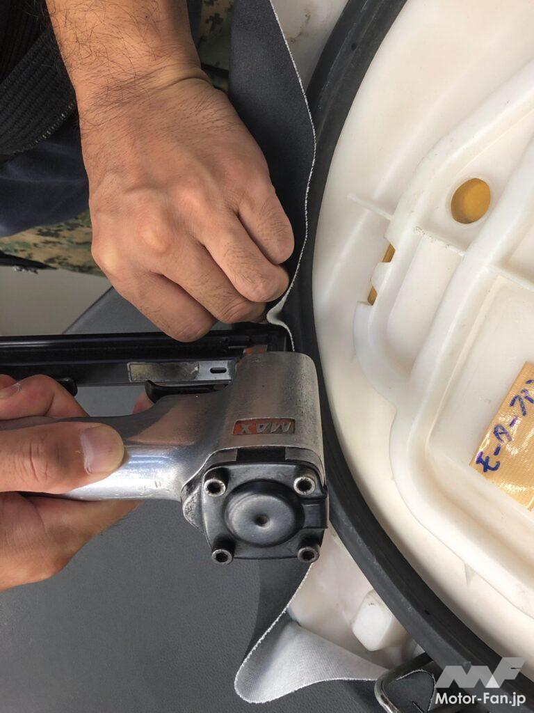 丸直に届いたシートの状況をプロの目でしっかりと確認。ノーマルの表皮を剥がして丸裸に。シートの破れていた部分は黒く汚れていますが、その他は意外ときれいな状態でした。