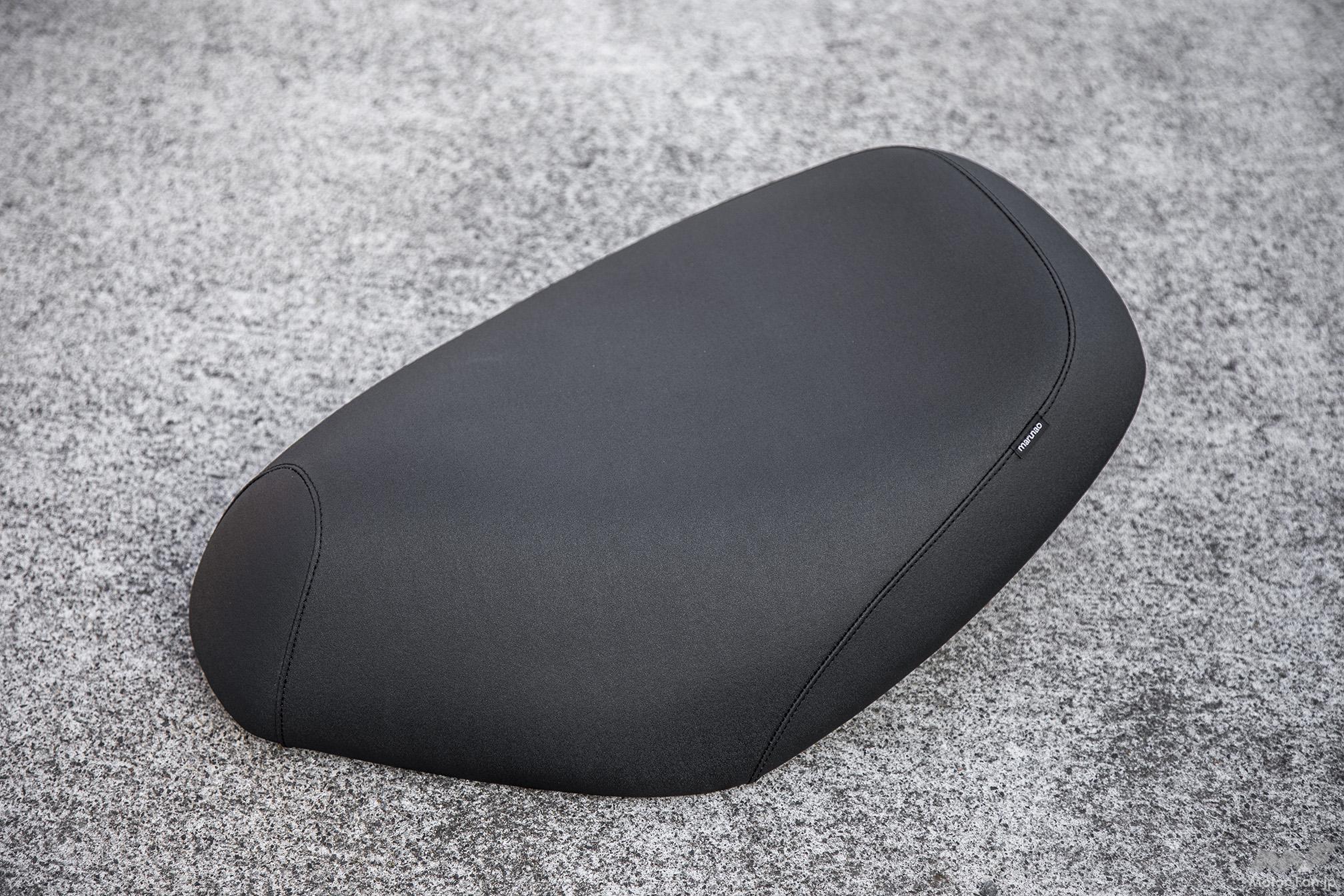 おおよそ1ヶ月後に到着した、新生シートがこちら。黒の表皮に黒いステッチで一見ノーマル風ですが、サイド部分に「marunaoタグ(白文字×黒地)」のアクセントが追加され、イイ感じです!