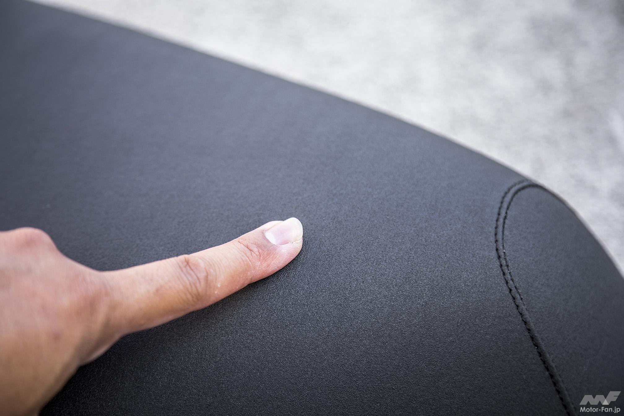純正シート風を狙って選んだ黒の表皮の出来栄えは素晴らしく、ゲルが埋め込まれている部分も、じ〜っくりと見ないとよくわからないほどナチュラルな仕上がりはさすが職人技です。