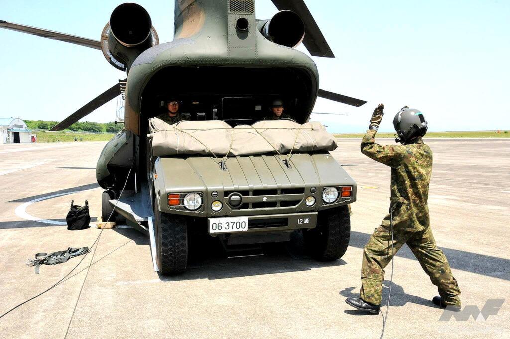 最大積載時の総重量は約4トンで、航空自衛隊のCH-130Hなどの輸送機や陸上自衛隊のCH-47J大型輸送ヘリによる航空輸送や、輸送ヘリの機外に吊り下げての空輸も可能になっています。装備されている大きなタイヤは、タイヤが傷ついて空気圧が低下しても一定距離を走行できるランフラットタイヤで、空気圧調整装置も搭載されています。
