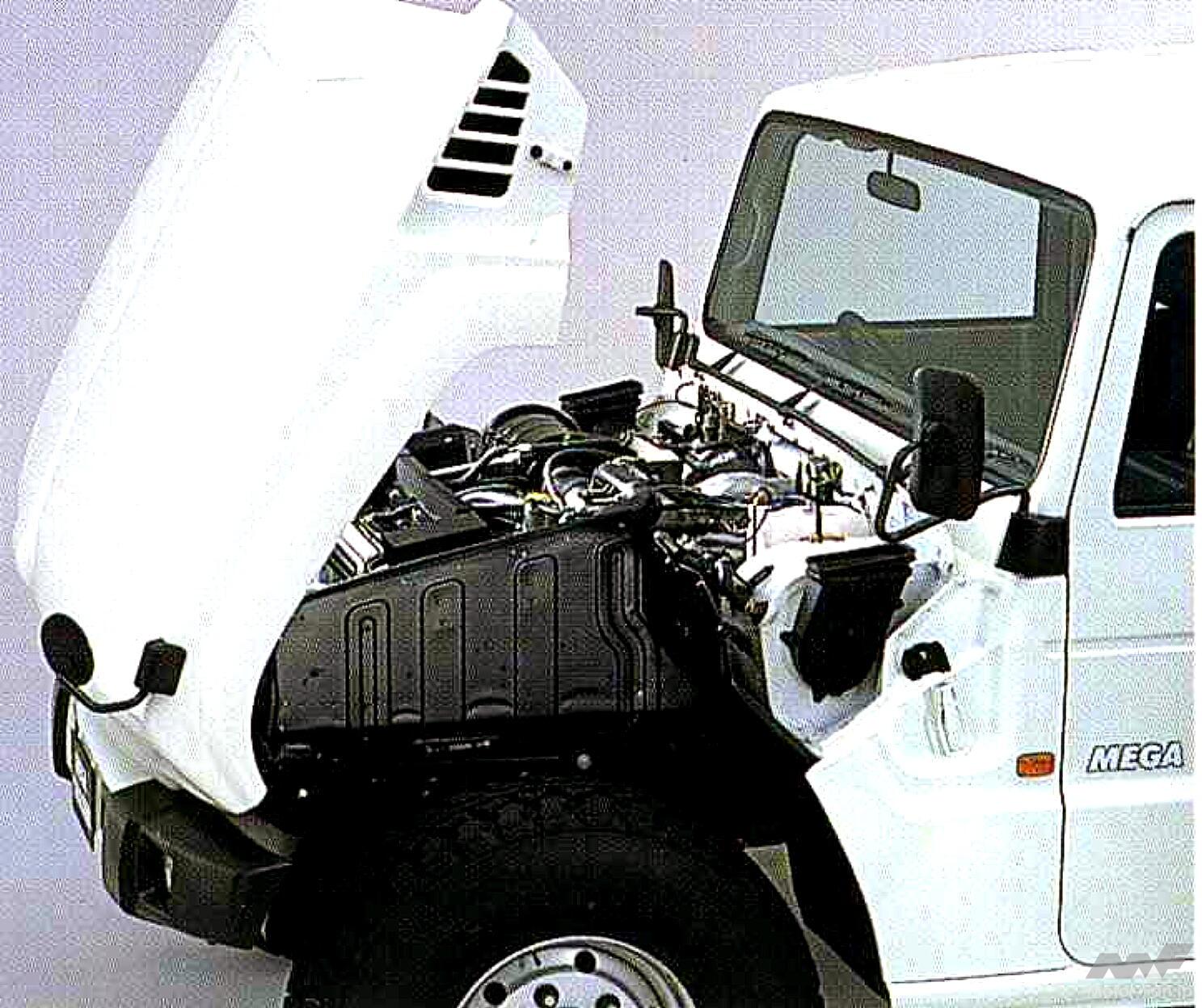 エンジンは当初はトヨタ製のB型と呼ばれるディーゼルエンジン・シリーズのうちの15B型、その直接噴射式 インタークーラーターボ付きの15B-FT型が搭載されました。このエンジンの大元はトヨタグループのダイハツと共同開発されたもので、1969年からトヨタ系のダイナやトヨエースのような中型トラックやコースターのようなマイクロバスなどの主力エンジンとして広く用いられている、信頼と実績に富んだものです。その後、厳しさを増した排気ガス規制に対応し、改良型である電子制御直接噴射式インタークーラーターボ付きの15B-FTE型へ更新。出力も150psから170psに向上して、より環境に優しく、より強力なものになりました。