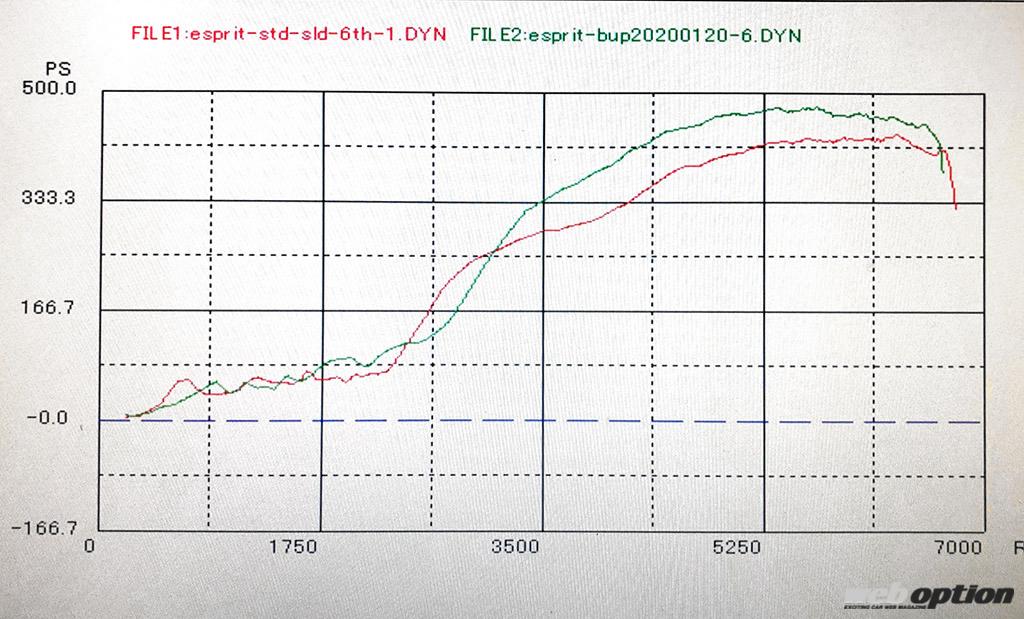 発売直後から400Rチューンを開始したエスプリは、少しずつセッティングを煮詰めていき、現在はマフラー交換にECUチューニングを組み合わせた約470ps仕様(最大ブースト1.3キロ)としている。なお、エンドユーザーに対してはマージンを確保した450ps仕様(10万4500円)のチューンドECUをすでに提供中だ。