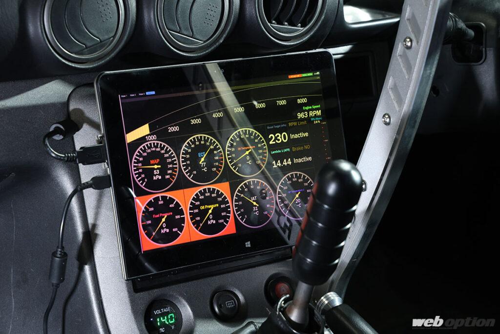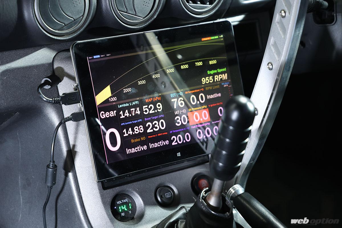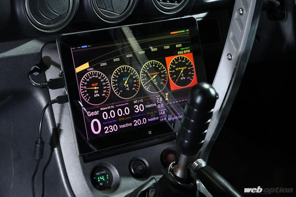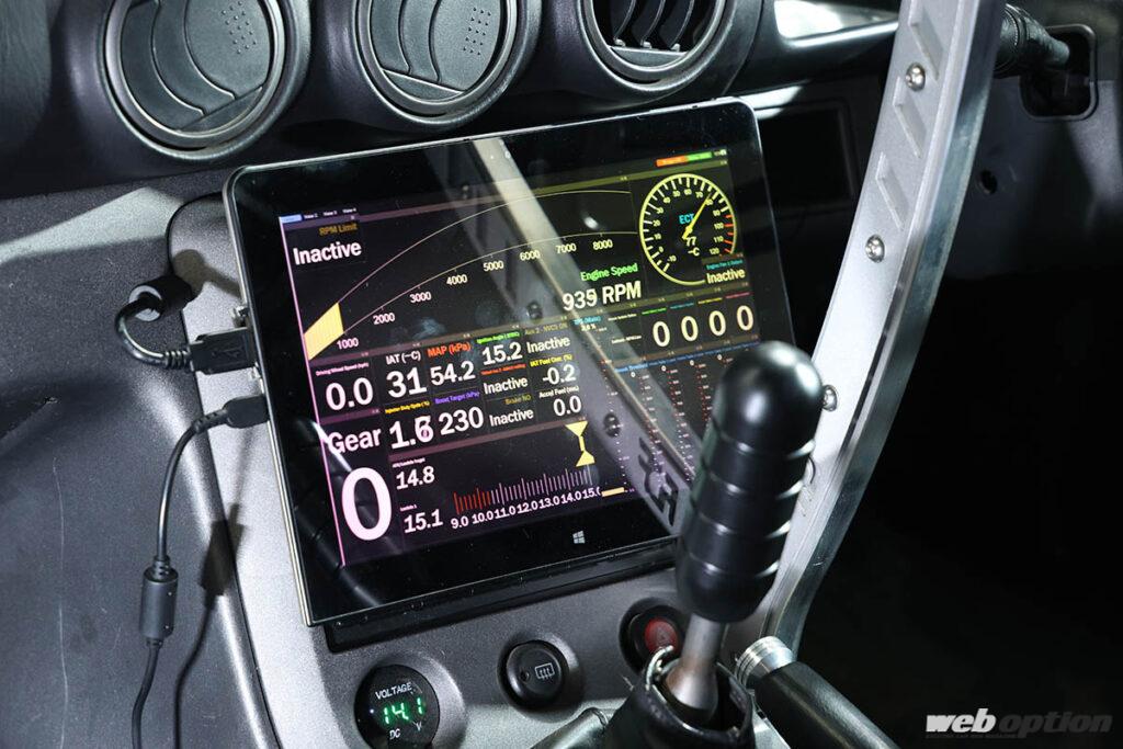 なお、タブレットモニターに表示させる項目はカスタム可能で、現在は4種類のパターンを試している。走行時に見るというよりも、インカームービーに映し込んで簡易ロガー的にプレイバック&チェックすることが多いという。