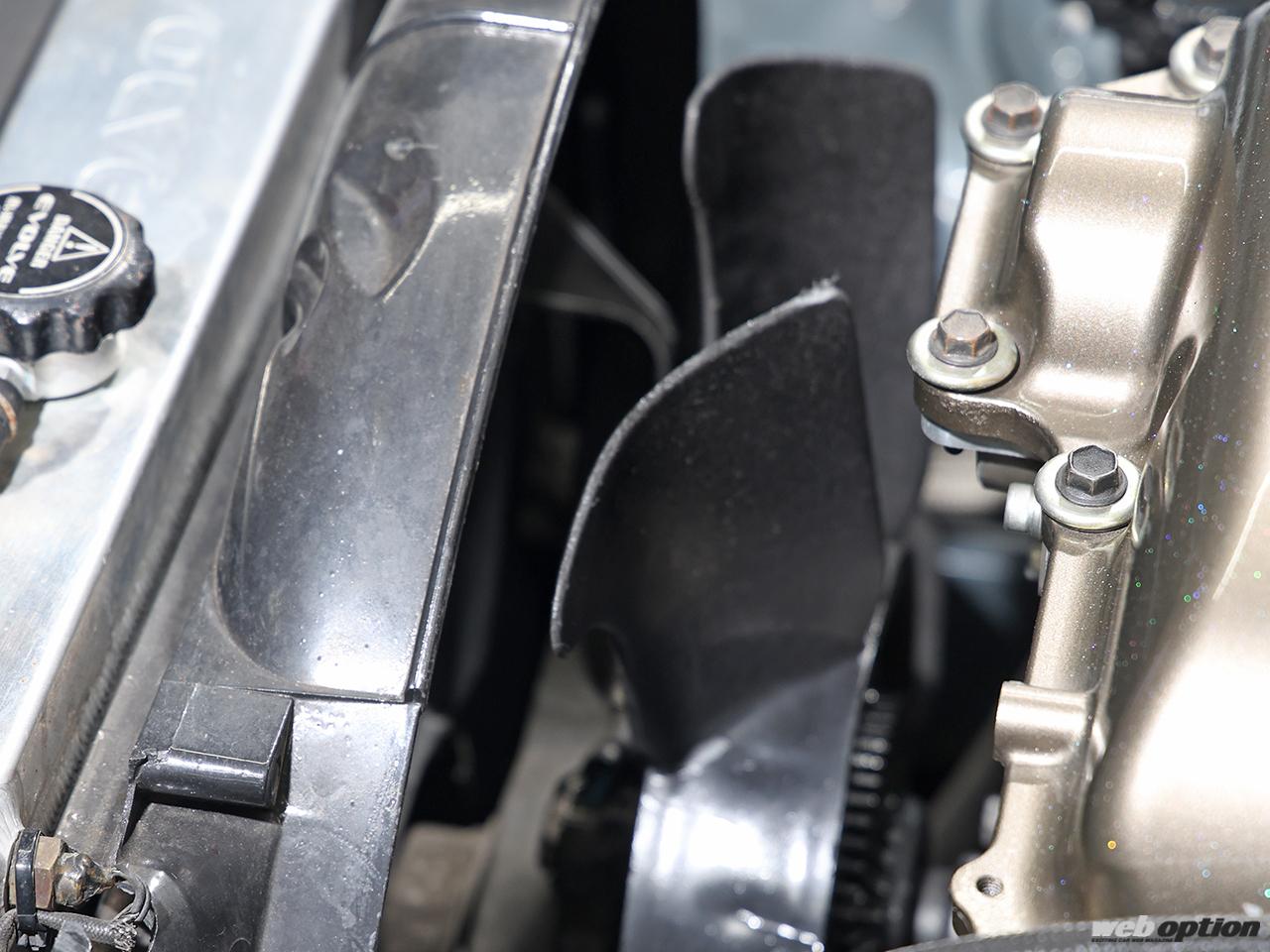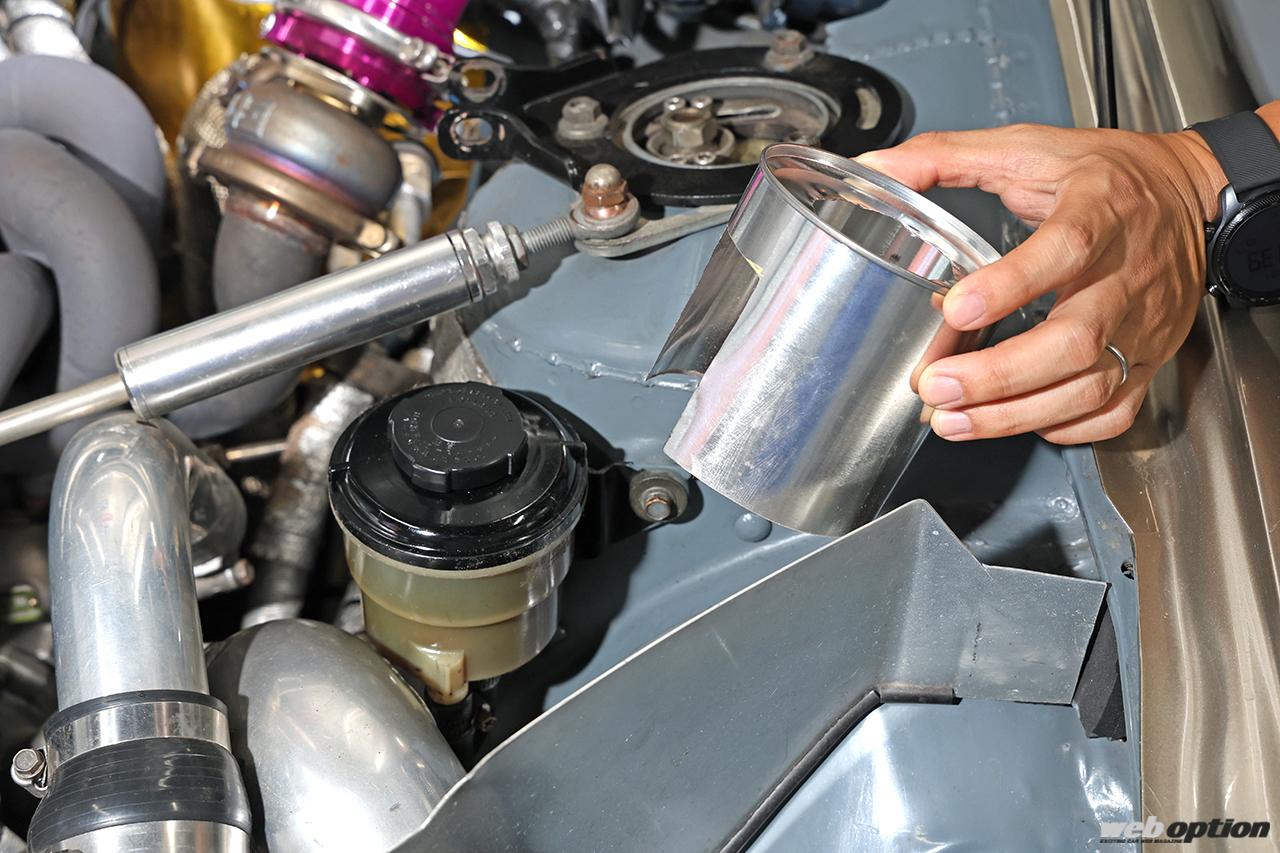 その他、エンジンルームは白いファンをブラックアウトしたり、黄ばんだパワステタンクを自作のメッキ缶カバーで覆うなど小技的なルックス向上策も多数講じられている。
