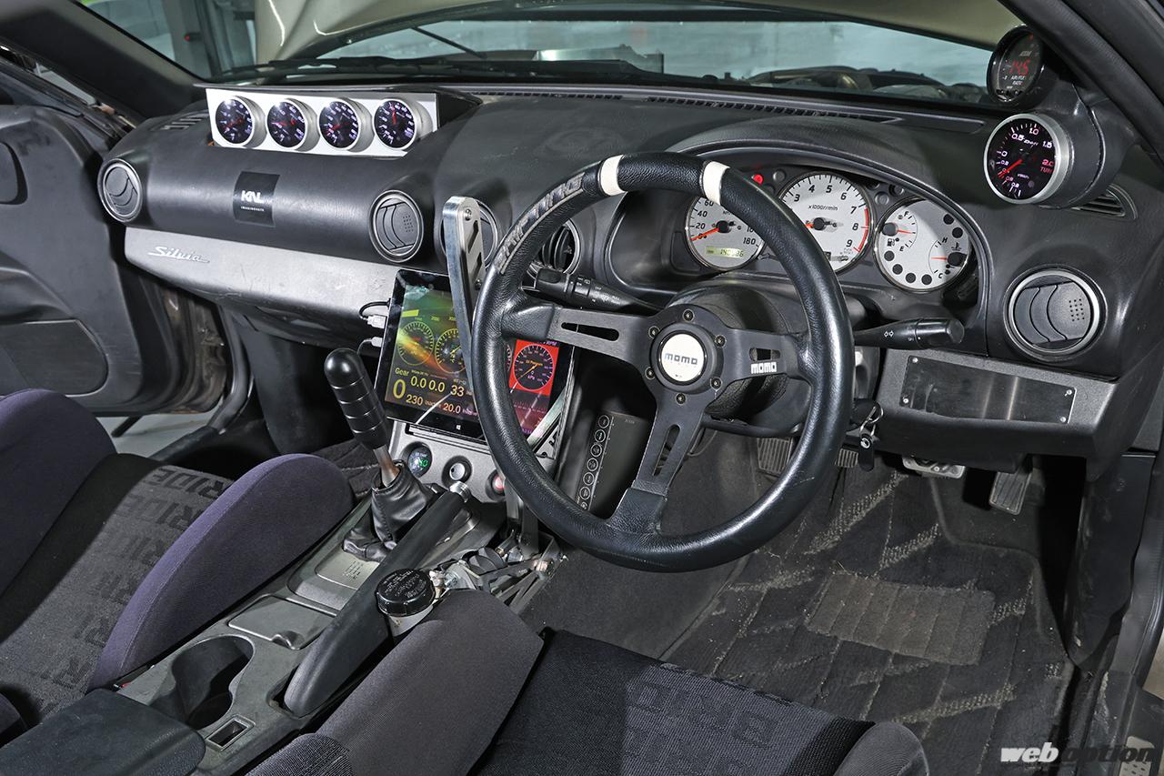 インテリアメイクも拘りが満載だ。助手席エアバッグ位置にデフィの60φメーターを4連で並べ(撤去予定)、その他の車両情報はセンターコンソールに設置したタブレットモニターに表示。油圧サイドブレーキレバーがドリフト仕様を物語る。ステアリングはMOMOドリフティングだ。
