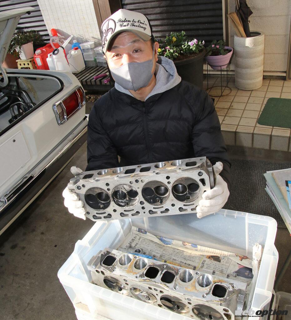 シリンダーヘッドは様々な形状をテストしながら理想を追求。中村さんが手に持っているのは、貴重な日産スポーツオプションヘッド。バルブが落ちて燃焼室を破壊してしまったが、修理して使いたいと思っているそうだ。