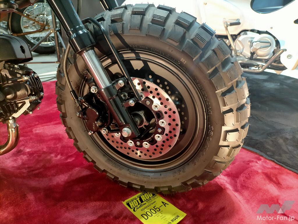 前後ホイールはノーマルと同寸の12インチだが、ワイドタイプに変更して前後130/80-12のワイド型ブロックパターンタイヤを組み合わせ。トラッカーテイストを取り入れた、迫力あるワイド&ローダウンスタイルを演出。
