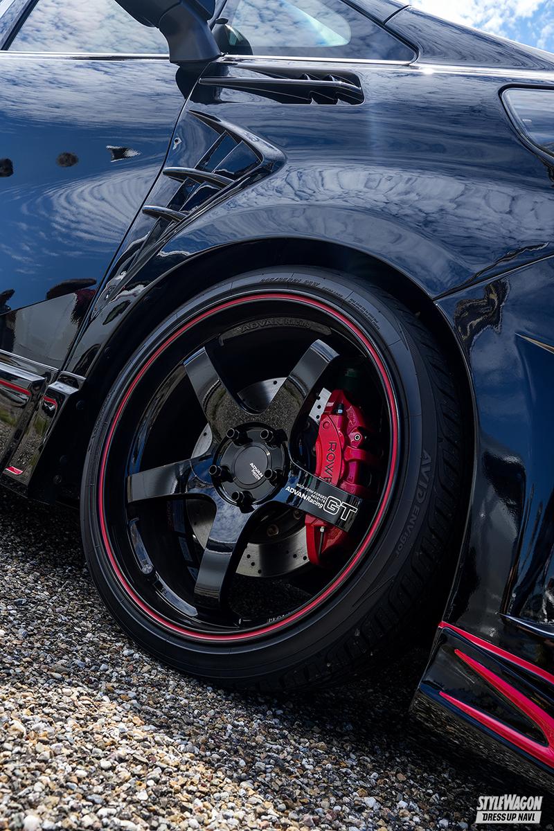 WHEEL●ヨコハマ・アドバンレーシングGTプレミアムバージョン(21×9.5+40) TIRE●ヨコハマ(235/35) EXTERIOR●F/S/R/ウイング/フェンダー=ロェン、ヘッドライト=アマプリ工房、テール=ヴァレンティ TUNING●車高調=テイン、マフラー/ブレーキ=ロェン、アーム類 他