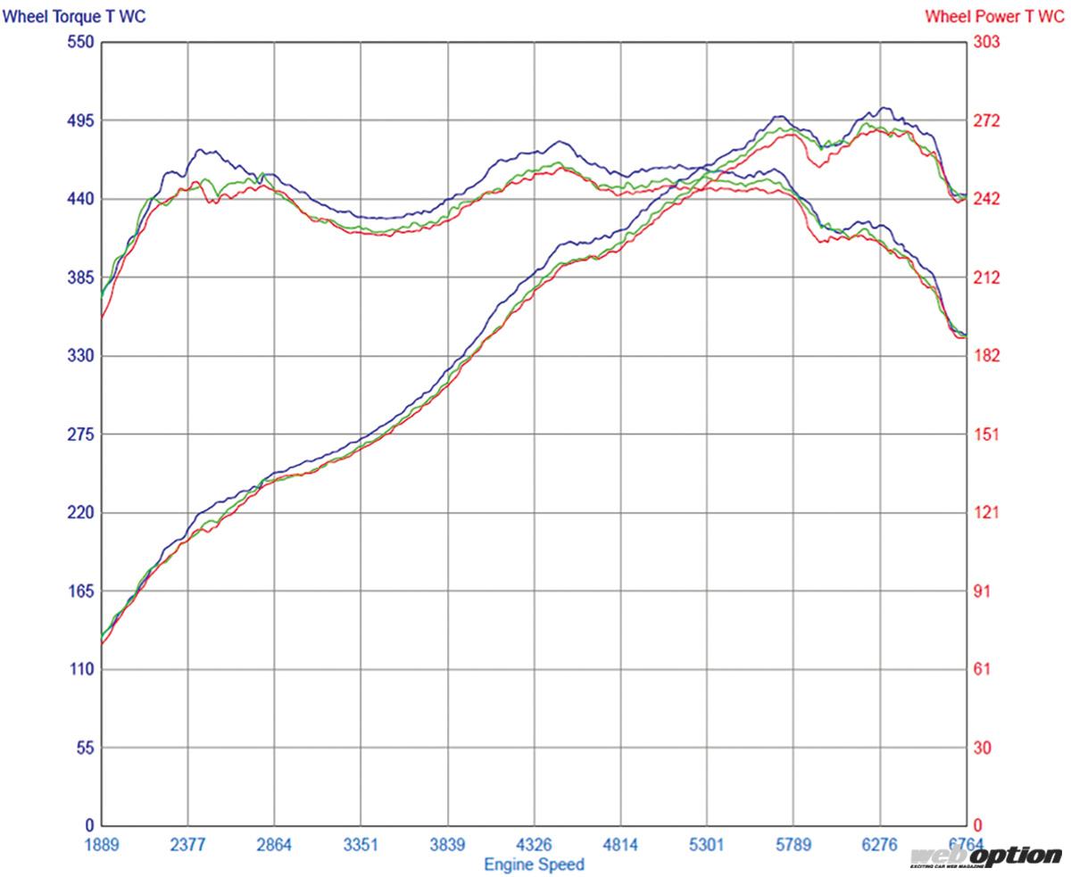 フロントパイプ交換の効果は絶大だ。フジツボの社内テストでは、単体交換のみで約3ps&約3.5Nmの出力アップを確認。パワー&トルクともに最大変化幅こそ大きくはないが、2000rpm〜4000rpmという実用域の特性を改善させることで、数値以上にパンチ溢れる走りを生み出してくれる。