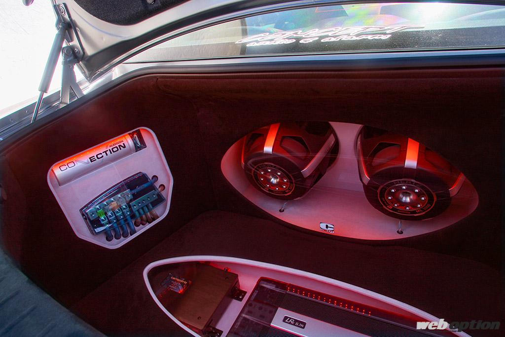 リヤシートバック中央部の純正リヤスピーカーを取り外し、サブウーファーが発生する重低音を車内に引き込むトンネルを製作。トランク同様、光の演出が行われている。オーディオはフロント2WAY+サブウーファーという、もっともシンプルに音質を追い込める通好みのシステムで、プロセッサー制御によるものだけではなく、インストールの妙も重要となる。