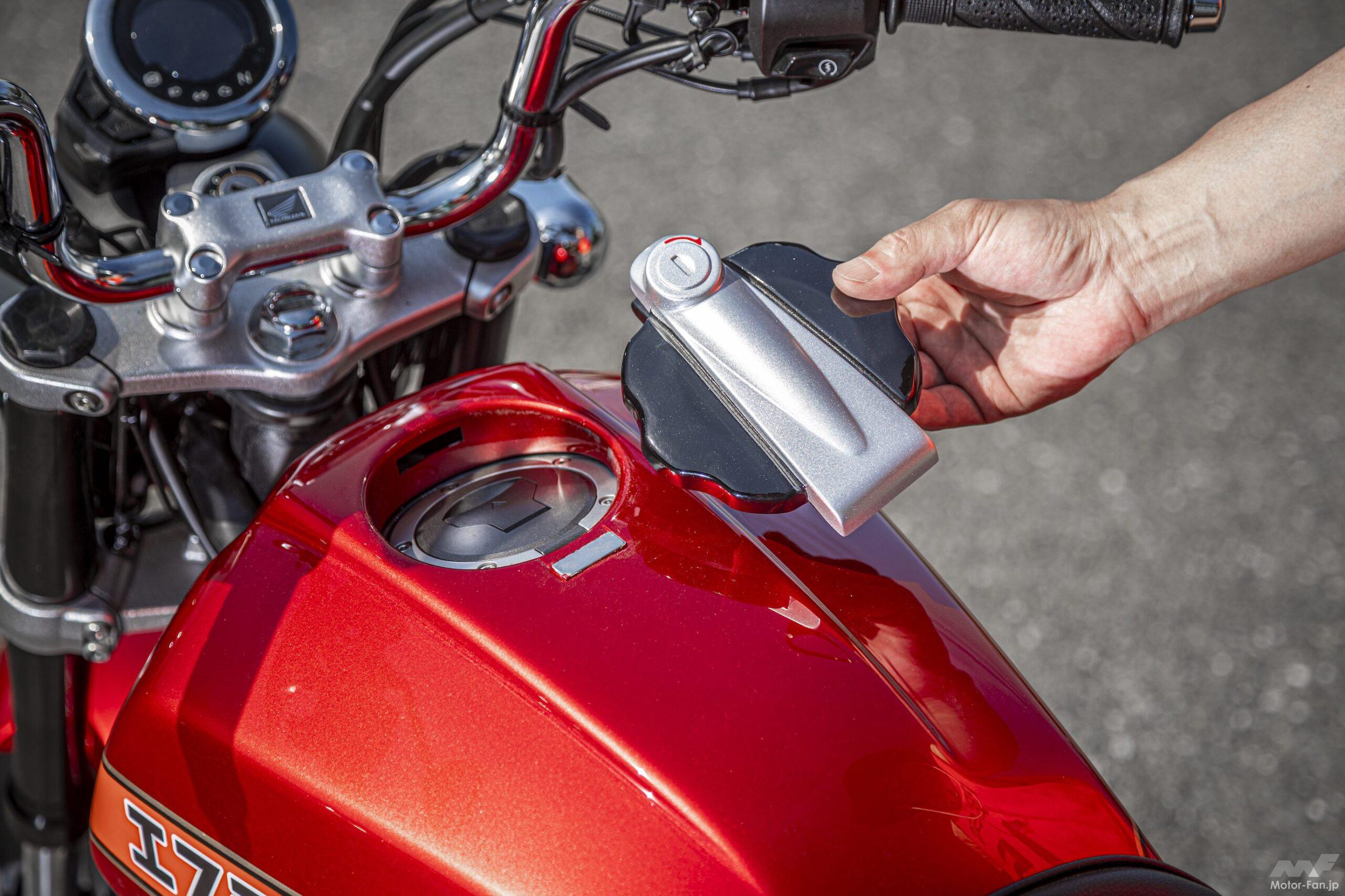 純正タンクをインナータンクとしてCB-F風タンクからテールカウルまで一体構造をしたのはアイデアもの。しかも「エフモン」にはFRP製のタンクキャップが付属するため、給油時以外はCB-F風スタイルを崩さない。このタンクキャップは前方の突起を切り欠き部に差し込み、モンキー125純正タンクの金属部へマグネットで装着する。簡単に脱着できるうえ、振動などで外れる不安を解消している。