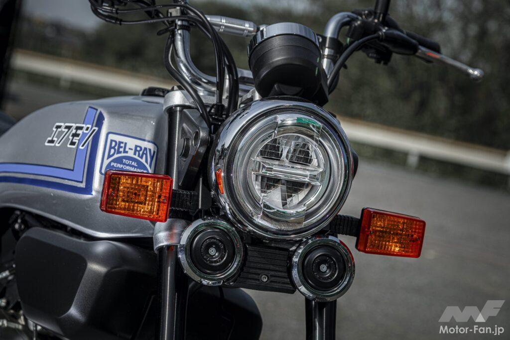 「エフモン」をさらにCB-F風に仕立ててくれるオプションも用意されている。それがこのスペンサー風シルバーカラーに塗装された個体。前後のウインカーを角形に、さらにホーン部もCB-Fデザインとしているので、より「らしさ」が味わえる。赤い個体とはフロントフェンダーなど細部が異なるが、これらは市販されているアフターパーツを組み合わせたもの。赤い個体のフロントフェンダーはグロム用だったりするのだ。この辺りは好みのパーツをチョイスする楽しみとしてとっておくのがいいだろう。