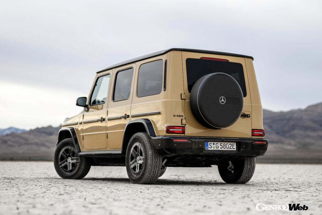 外観では他に、コンセプトEQGを彷彿とさせる専用のフロントマスクが与えられている。起動と同時にイルミネーションが明滅するのは少々、らしくないという気も。リヤフェンダーにはこれも空力対策だというスリットが入れられ、リヤにはスペアタイヤではなく充電ケーブルを収納しておくための小さなボックスが備わる。尚、内燃エンジンモデルの700mmを上回る850mmの最大渡河深度は、完全に密閉された電装系はもちろん、ラジエーターやエンジンに空気を取り込む穴が塞がれたこの外装のおかげだという。
