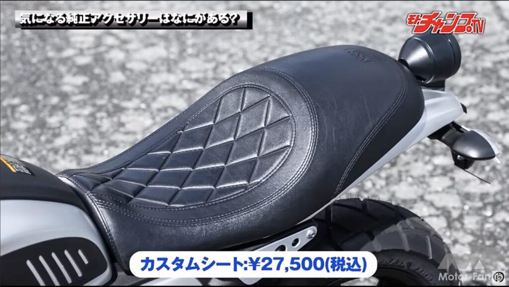 ビキニカウル同様にカフェレーサースタイルの決め手になるのがカスタムシート。シングルシート風なデザインとされていてステッチの模様も純正とは明らかに異なるもの。また後ろ端にはXSRのロゴが入るため、非常に高いクオリティとなっている。
