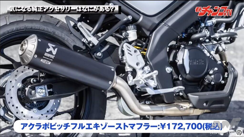 最後h少々値段が張るもののルックスを大きく変化させるとともに弾けるようなサウンドを生み出すアクラポビッチ製のフルエキゾーストマフラー。もちろんJMCA認証プレートが付く音量となっていて、サイレンサーは高品質なチタン製。アクラポビッチロゴだけでなくXSR125のロゴがレーザー刻印されている。軽量化にも貢献してくれる。