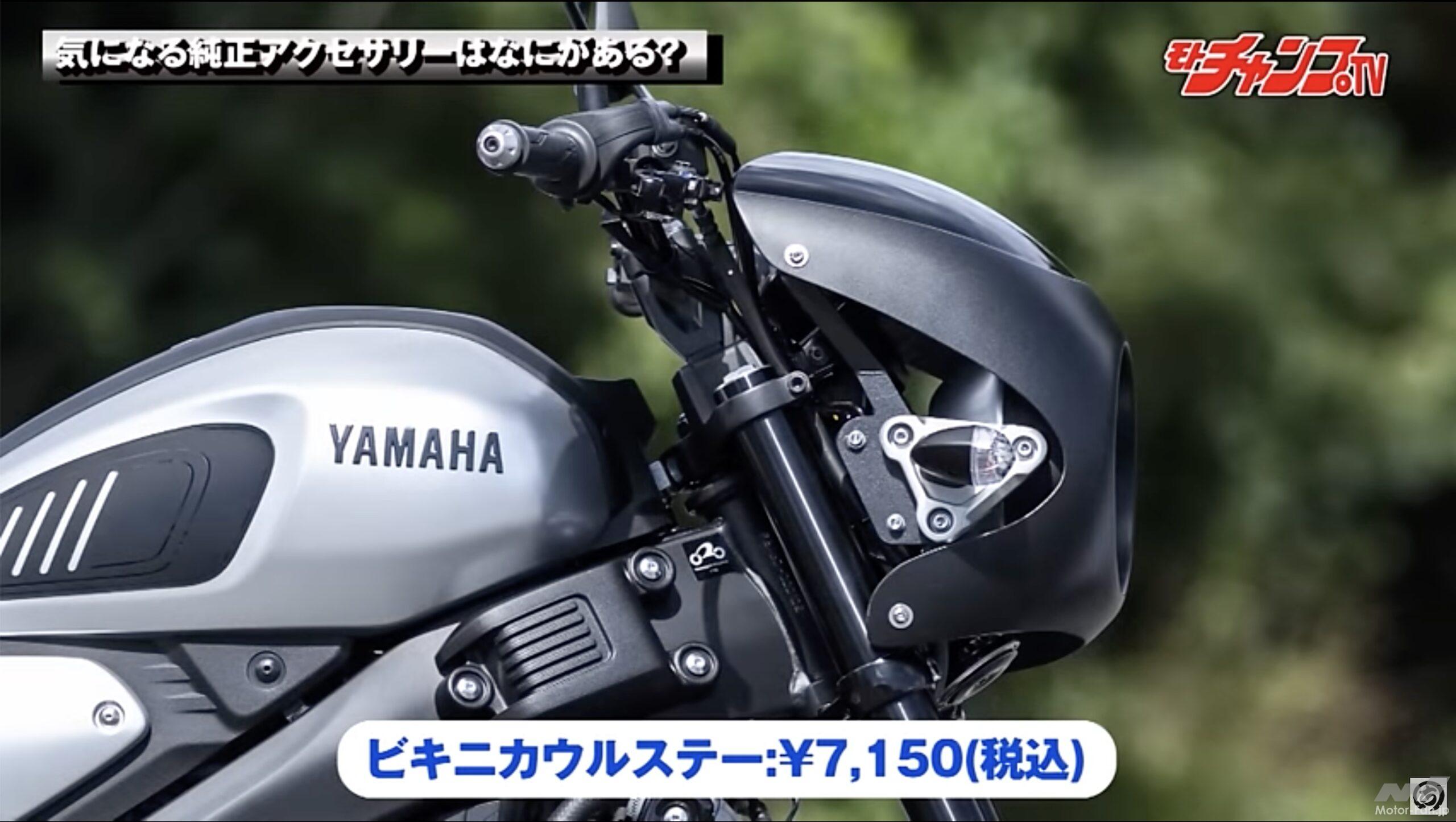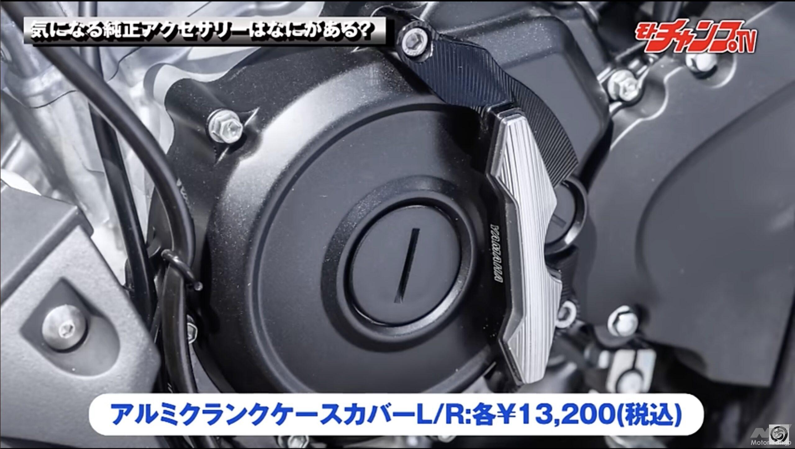 足が当たる部分で転倒時の保護になるばかりでなく、エンジンの存在感をより演出してくれるのがアルミクランクケースカバー。左右にそれぞれ別部品として設定されていて。高品質なアルミ削り出しパーツで、どちらにもヤマハのロゴが入る。