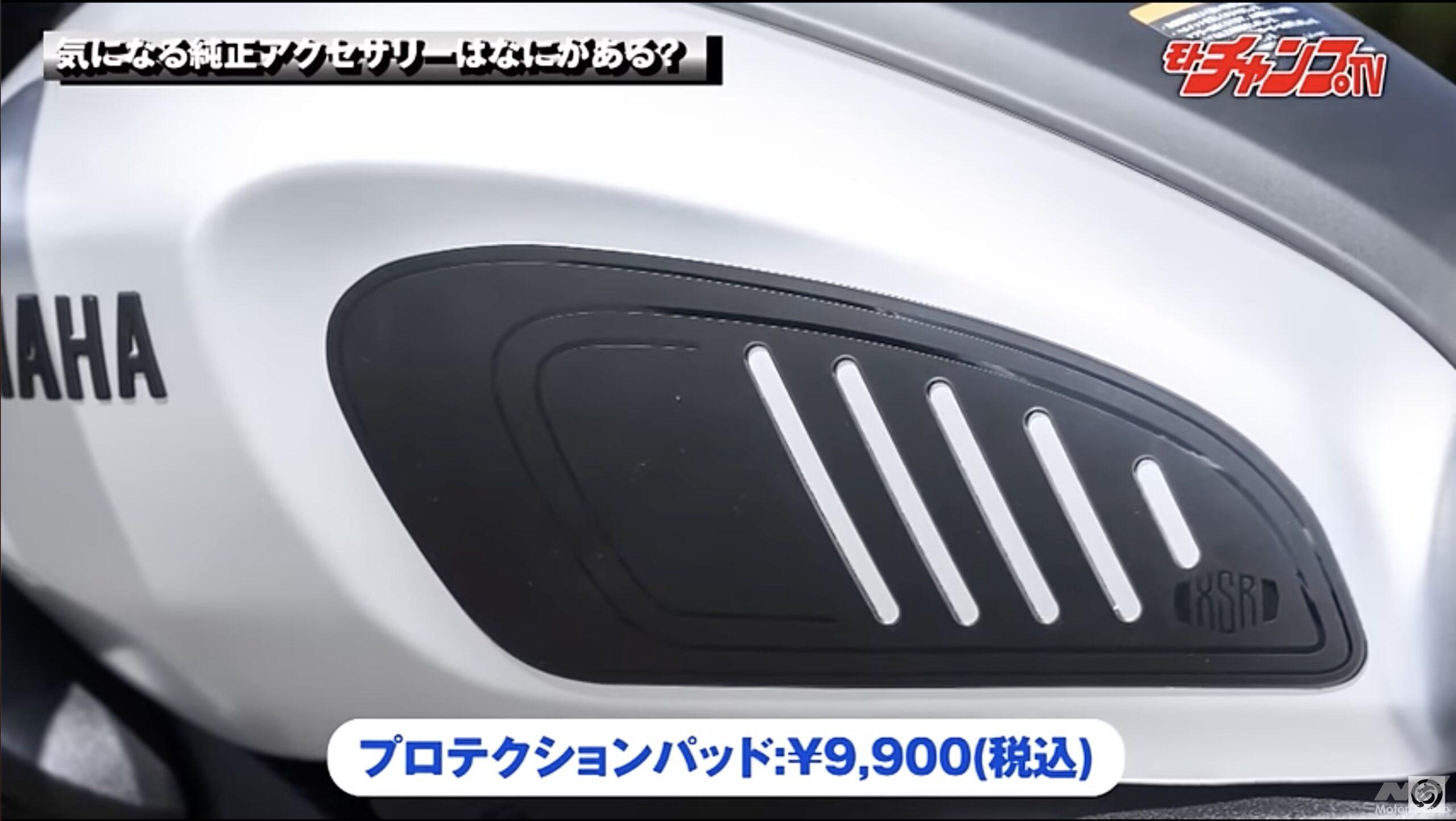 容量10リッターで少々大柄な燃料タンクはレッドとブルーにはストライプが入るものの、シルバーやブラックはヤマハのロゴだけなので少々単調に見える。そこで考えたいのがアクセントになるプロテクションパッド。タンクのデザインをより引き締めて見せてくれるだけでなく、ニーグリップする際には滑り止めにもなる。