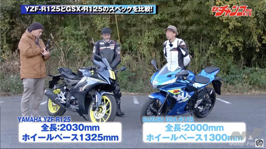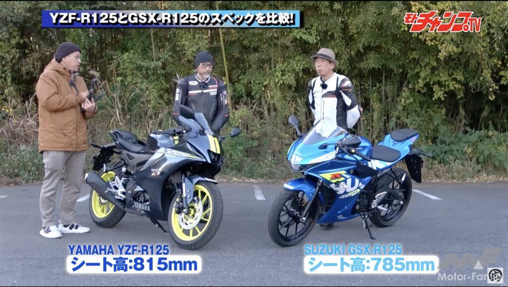 実際にライダーがまたがると、その印象は際立つ。ケニー佐川がまたがるYZF-R125は普通のスポーツバイクらしい眺めなのだが、中村友彦がまたがるGSX-R125はミニバイクのように小さく見える。逆にYZF-R125が125ccらしくない車格ともいえるだろうか。それなのに大差ない車両重量というのは、設計年度の違いかもしれない。