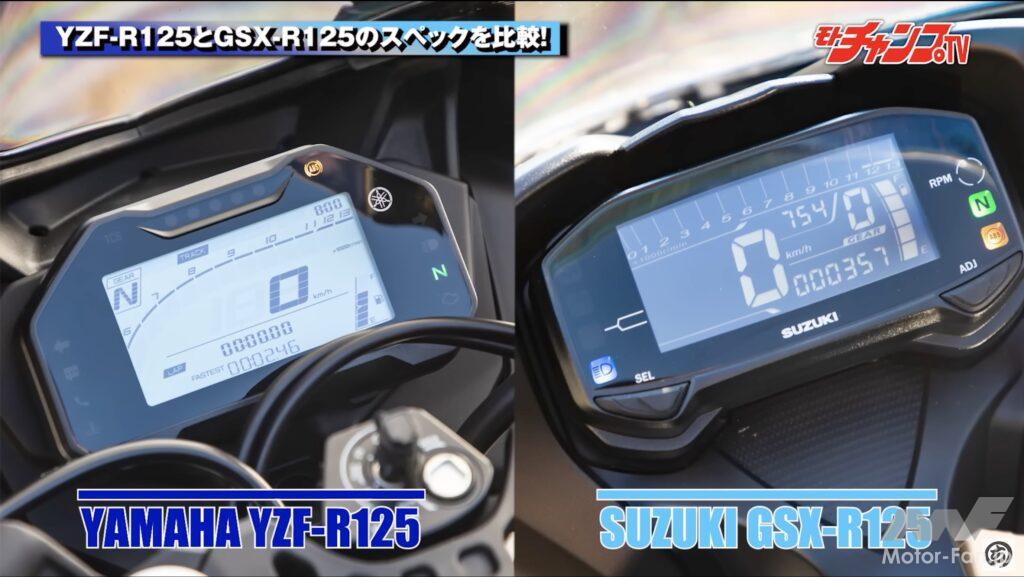 エンジンはどちらも水冷単気筒4バルブで最高出力も同じ15ps。だが、GSX-R125は動弁機構がDOHCであり最高出力発生回転数も10500rpmと高い。明らかな高回転型エンジンだといえる。それに対してYZF-R125はSOHC4バルブであり可変バルブ機構であるVVAを備える。低中回転と高回転でカムシャフトを切り替え最適なバルブタイミングが得られるようにされている。これにより低中回転域での豊かなトルク特性と高回転での弾けるパワーを両立している。そのため試乗後の印象が意外なことになったのだ。