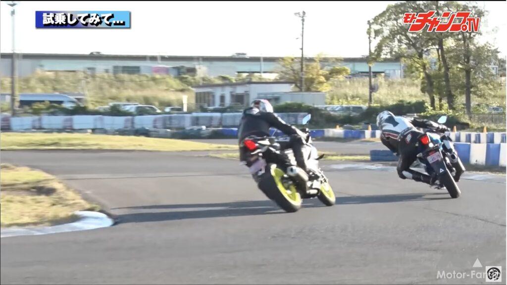 ミニサーキットでの比較試乗はケニー佐川と中村友彦が2台を乗り換えて交互に走らせている。2人とも2台を直接乗り比べることで、どう違うのかを探ったのだ。事前にGSX-R125はレーサーレプリカのように尖った存在であり、軽量コンパクトなこともあってサーキットでは有利と思われた。ところが比較しながら試乗してみると、意外にもYZF-R125が圧倒的に有利ということが判明した。
