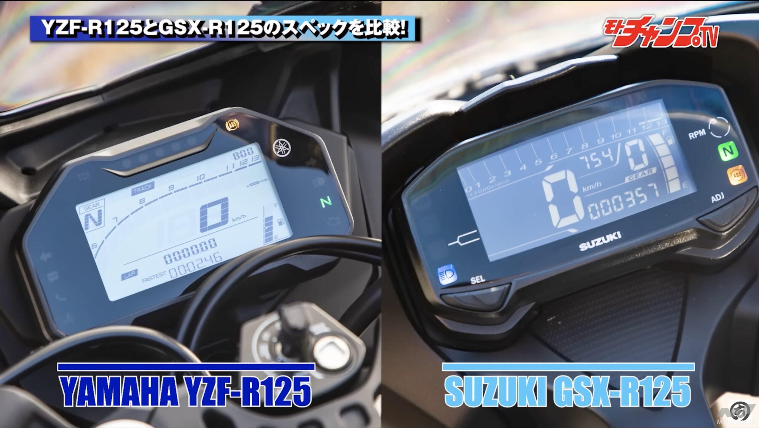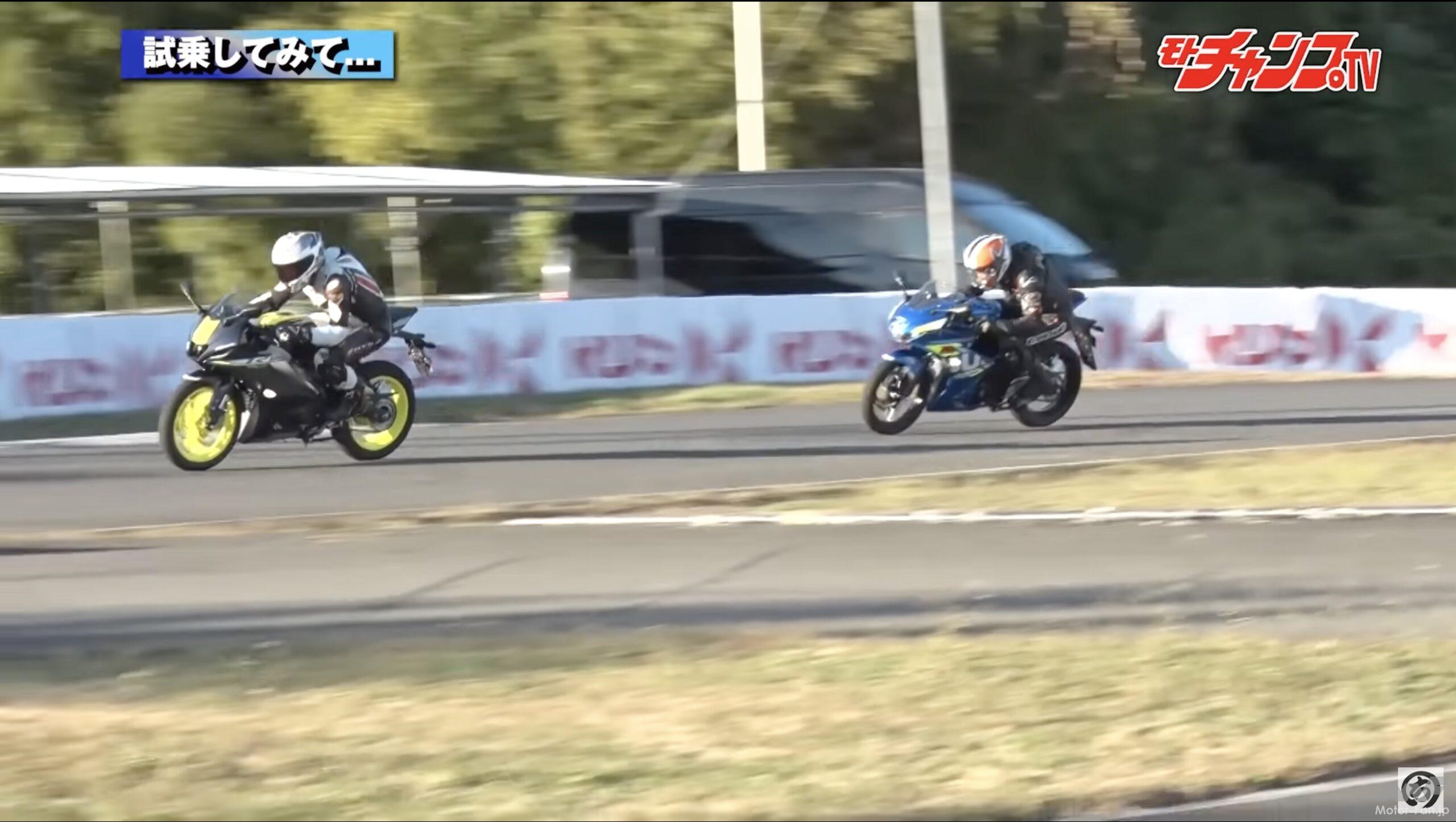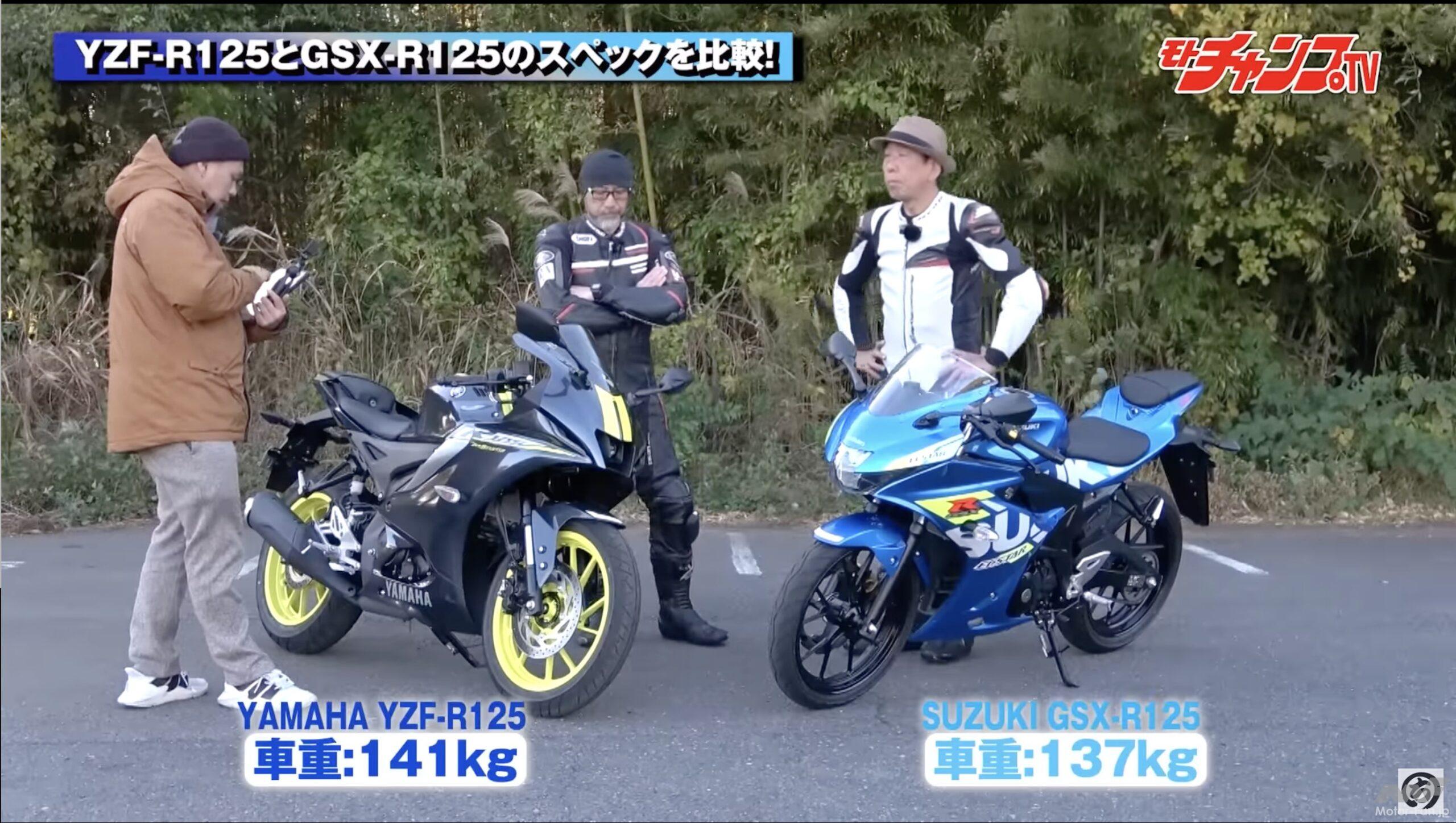 実際にライダーがまたがると、その印象は際立つ。ケニー佐川がまたがるYZF-R125は普通のスポーツバイクらしい眺めなのだが、中村友彦がまたがるGSX-R125はミニバイクのように小さく見える。逆にYZF-R125が125ccらしくない車格ともいえるだろうか。それなのに大差ない車両重量というのは、設計年度の違いかもしれない。