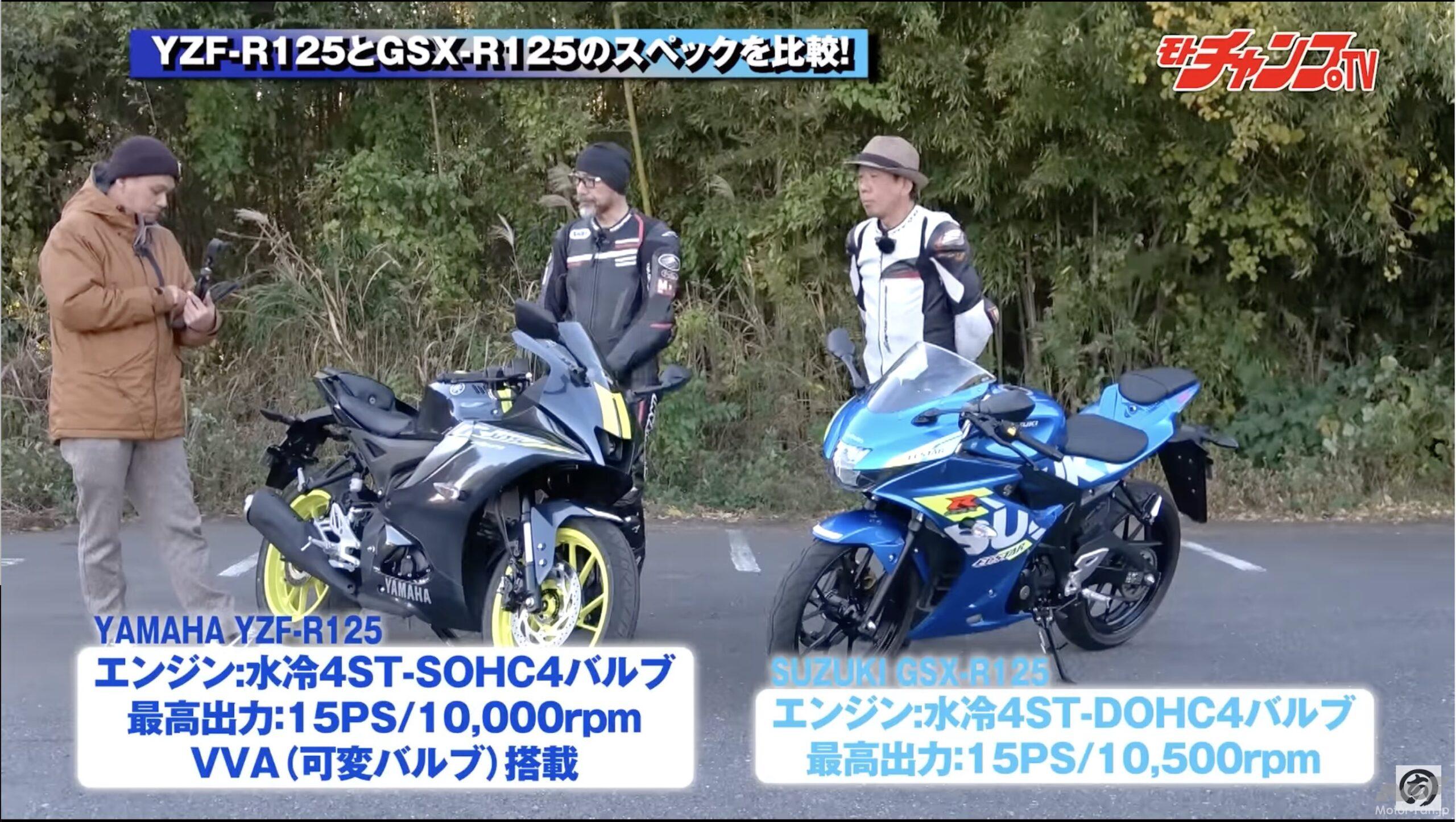 エンジンはどちらも水冷単気筒4バルブで最高出力も同じ15ps。だが、GSX-R125は動弁機構がDOHCであり最高出力発生回転数も10500rpmと高い。明らかな高回転型エンジンだといえる。それに対してYZF-R125はSOHC4バルブであり可変バルブ機構であるVVAを備える。低中回転と高回転でカムシャフトを切り替え最適なバルブタイミングが得られるようにされている。これにより低中回転域での豊かなトルク特性と高回転での弾けるパワーを両立している。そのため試乗後の印象が意外なことになったのだ。