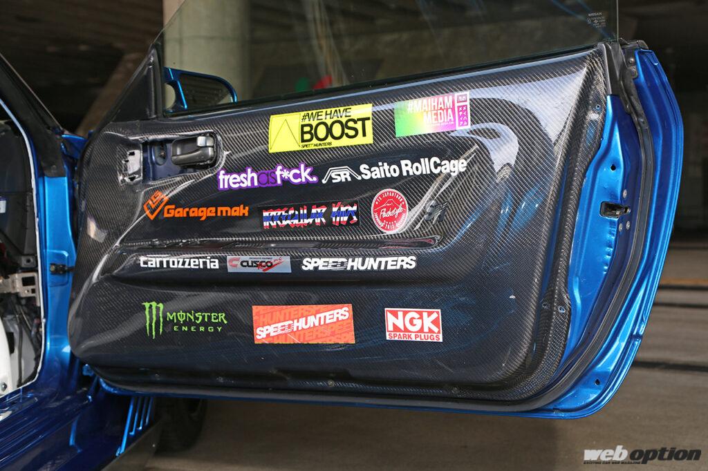 そしてエクステリアは、ガレージマックのフルエアロで統一。フロントはタイプ5、リヤはタイプ2バンパーに専用カナードを追加している。さらに、ワイドボディキットはサイドステップにカーボンプレートを加え、整流効果をアップ。カラーリングのブルーメタリックは他車用の純正色だが、カーボンパーツとのマッチングやバランスも良くオーナーもお気に入りの様子。