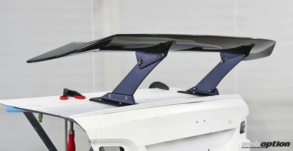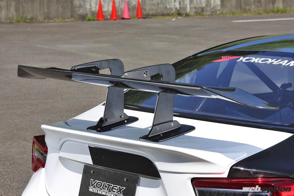 スーパーGTマシンのように、ウイングを吊り下げて固定するスワンネック仕様は最近のトレンドだが、もちろん規定の範囲内であれば車検は問題なくパスできる。写真はタイプ12のスワンネック仕様で、装着サンプル車両はスーパー耐久仕様のZN6型86となる。