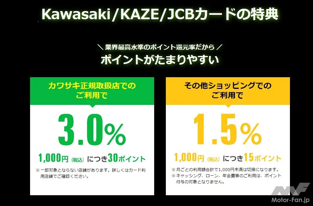 カワサキモーターサイクルやジェットスキーをさらに深く楽しめる、カワサキのライダーズクラブ「KAZE」では会員カードとクレジットカードが一体となった「KAZE/JCBカード」で新規入会キャンペーンを実施中だ。