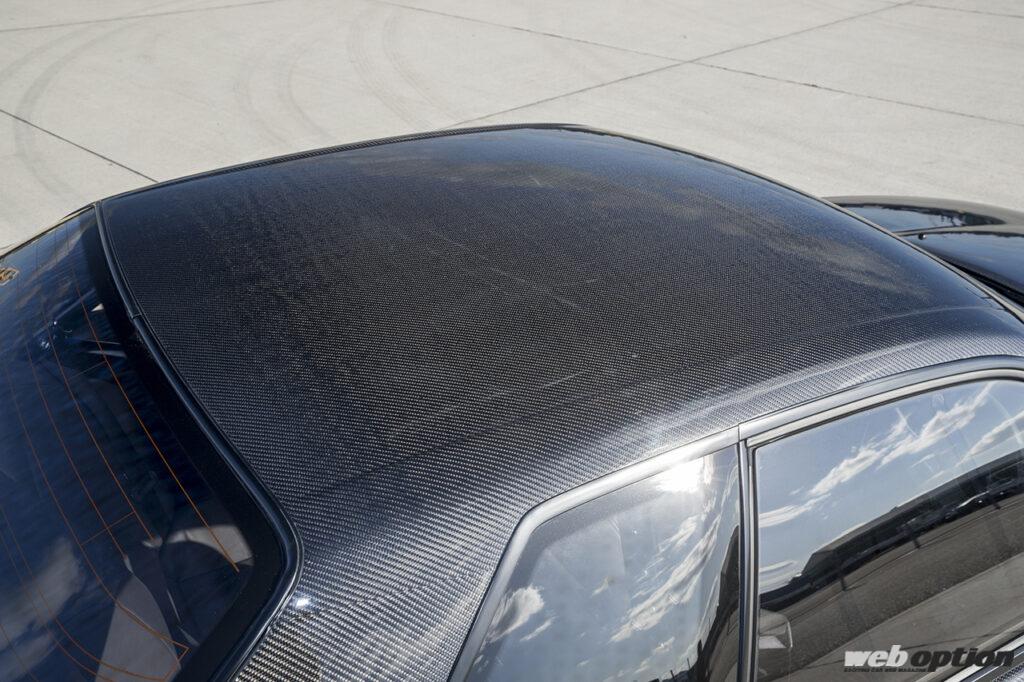 造形に約1年を費やしたというワイドボディキットはフルカーボン製。装着にあたっては、貼り付けなどの安易な取り付けではなく、ルーフやリヤフェンダーなど、モノコック一体の外板パーツまで全て取り外し、外板パーツをキット製品に置き換えることで寸分の狂い・ゆがみのない形に仕上げられている。