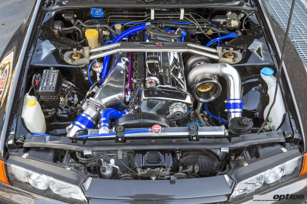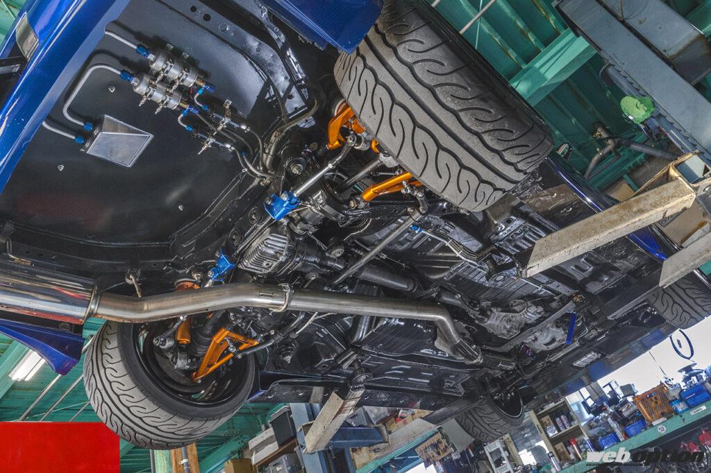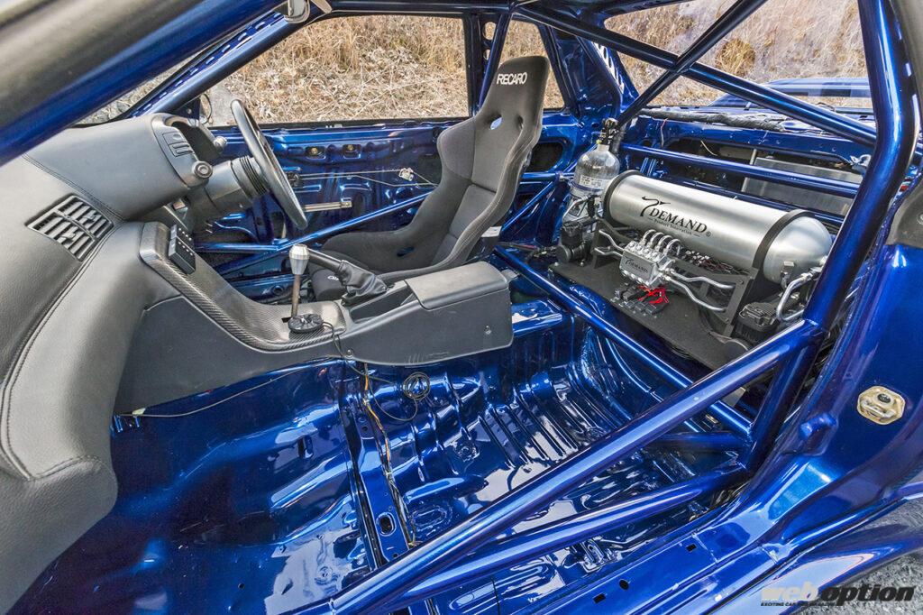カーボン地が透けて見えるキャンディ系に彩りされたブルーカーボンボディの中には、800psまでパフォーマンスの高められた2.7Lの高回転型ユニットを搭載。タービンはGTIII-5RでNOSも組み込まれている。ミッションはOS技研のシーケンシャルドグだ。
