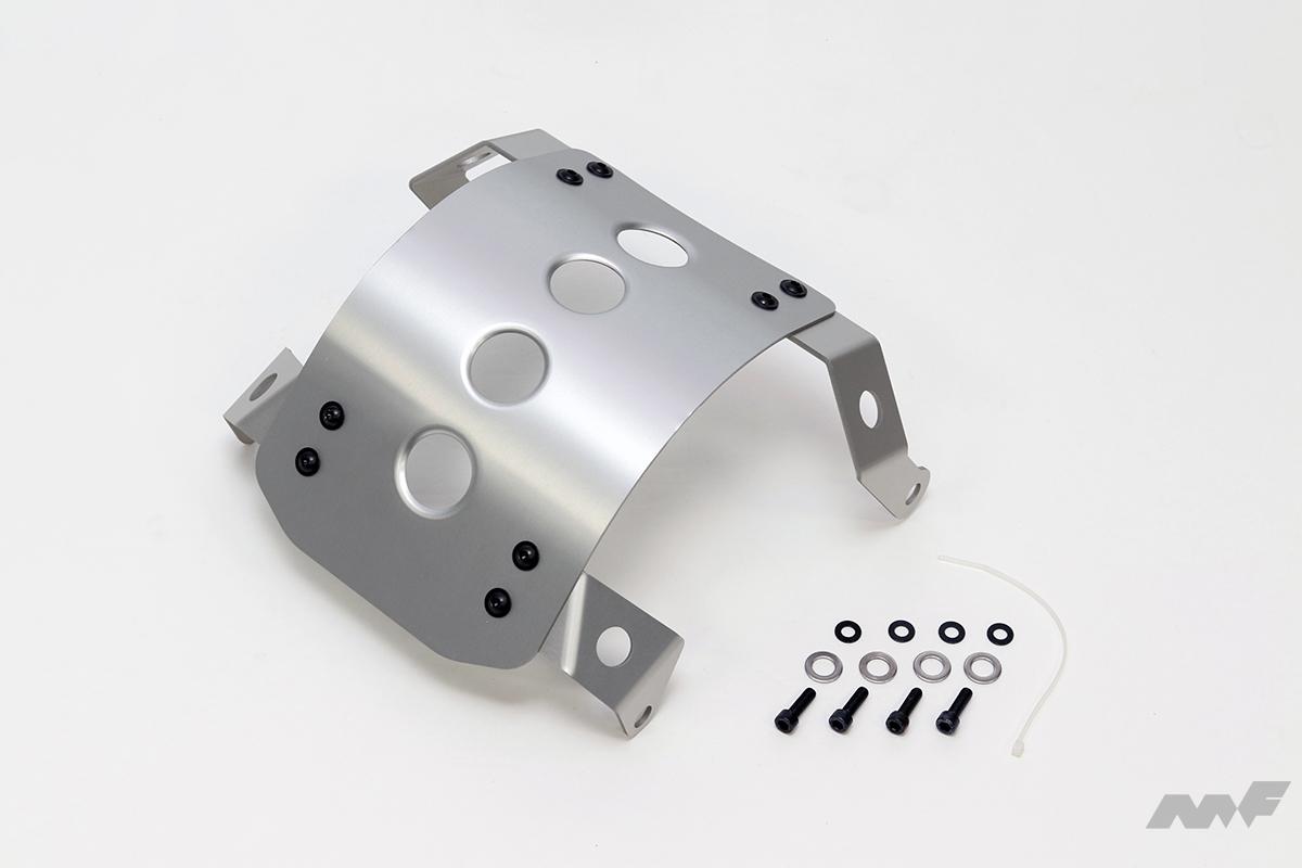 エンジンやリザーバータンクを飛び石や障害物からしっかりとガードするアイテム。アルミ製。シルバーアルマイト加工済み。