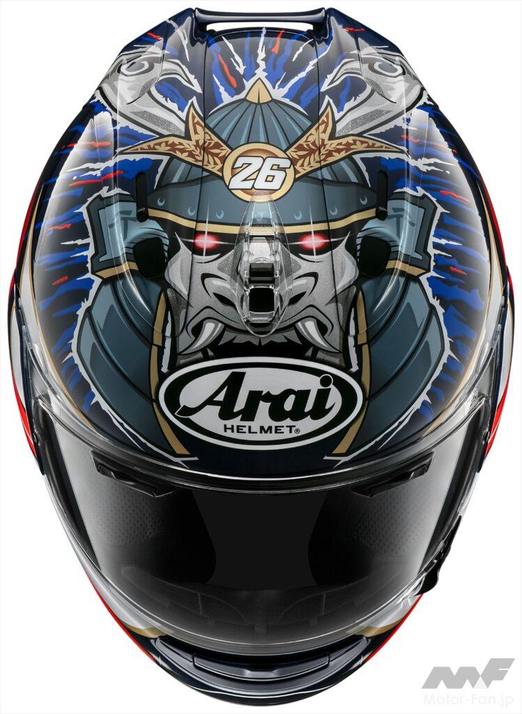今回追加されたグラフィック「PEDROSA-SHOGUN(ペドロサ-ショウグン)」は、スペイン出身のライダー、D・ペドロサ選手の最新カラーレプリカ。世界最高峰2輪レース「MotoGP」クラスにて12年間常にトップライダーの顔として戦い、2018年に現役引退後もKTMテストライダーとして今もスポットでMotoGPに参戦。走れば現役ライダーを脅かすライディングを見せるなど、往年の実力は健在だ。グラフィックはペドロサ選手が現役時代から大好きな日本の「侍スピリット」を表現。アメコミ風にアレンジされた大将軍の凄まじい形相を前面に押し出した、コミカルで主張の強いモデルとなっている。ウイングレットが装備された主張強めの4気筒スーパースポーツがもっとも似合いそうな、オンリーワンのデザインだ。