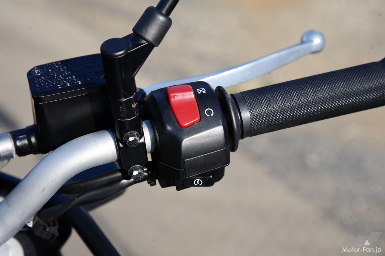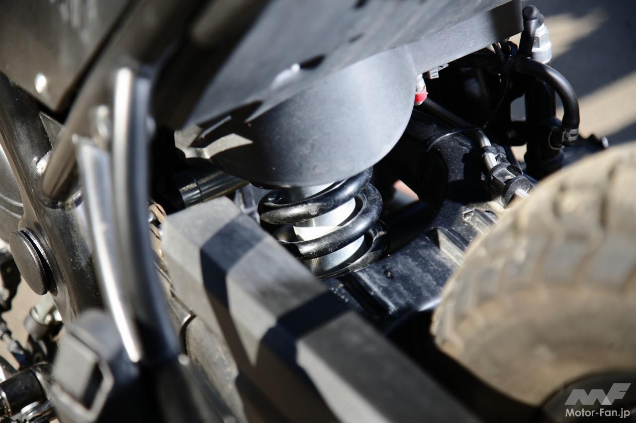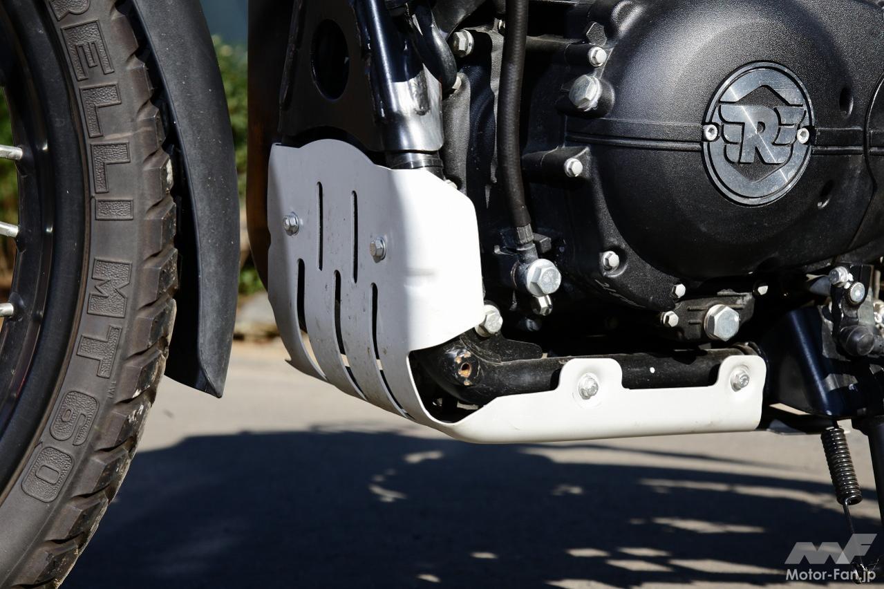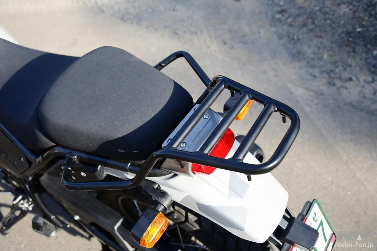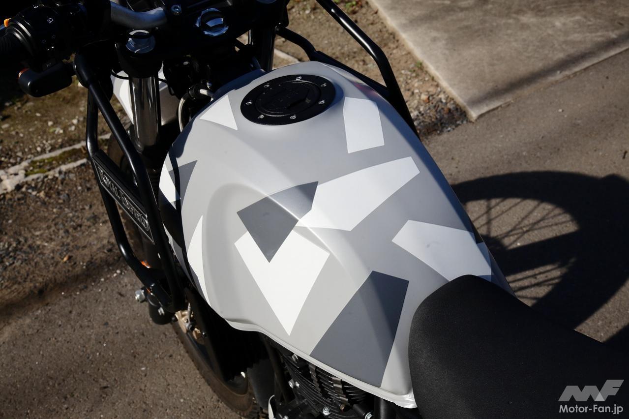 エンジンはシンプルな空冷のシングルシリンダー。6500回転で24.3bhp、24.6馬力を発生させる。丸形の大型ヘッドライトは高い位置にセットされ、クリアのスクリーンやサイドのガードとともに個性的なフェイスデザインを構築。フロントフェンダーはアップとダウンの2種類を装備している。ガソリンタンクは15ℓの容量があるため航続距離は長い。シート部分は見るからに低く設定されていて、スペック上も800mmという低さ。これが試乗の時にどう感じられるか楽しみだ。前後ともディスクブレーキを採用していて、現代のバイクとしては一般的なABSシステムも装備されている。