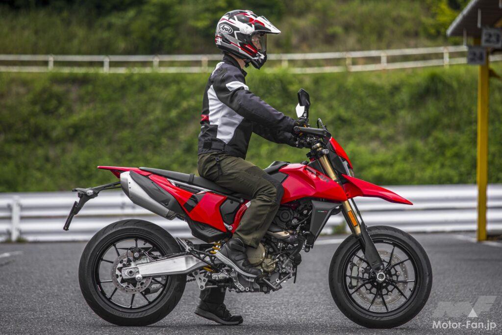 このハイパーモタード698モノ、とにかく軽さが際立っている。ガソリンなしでの公称車重は151kg。燃料タンク容量が12ℓなので、満タンなら単純計算でおよそ160kgに。MT-07より24kgも軽く、サイドスタンドから起こした瞬間に「軽っ!」と、思わず声に出してしまった。