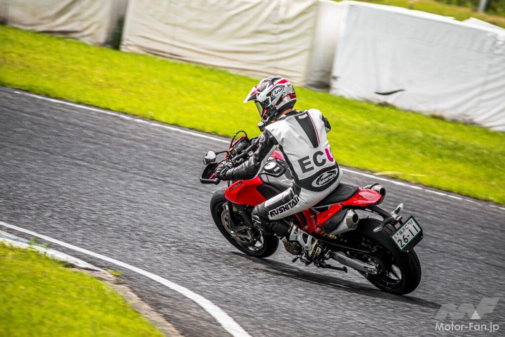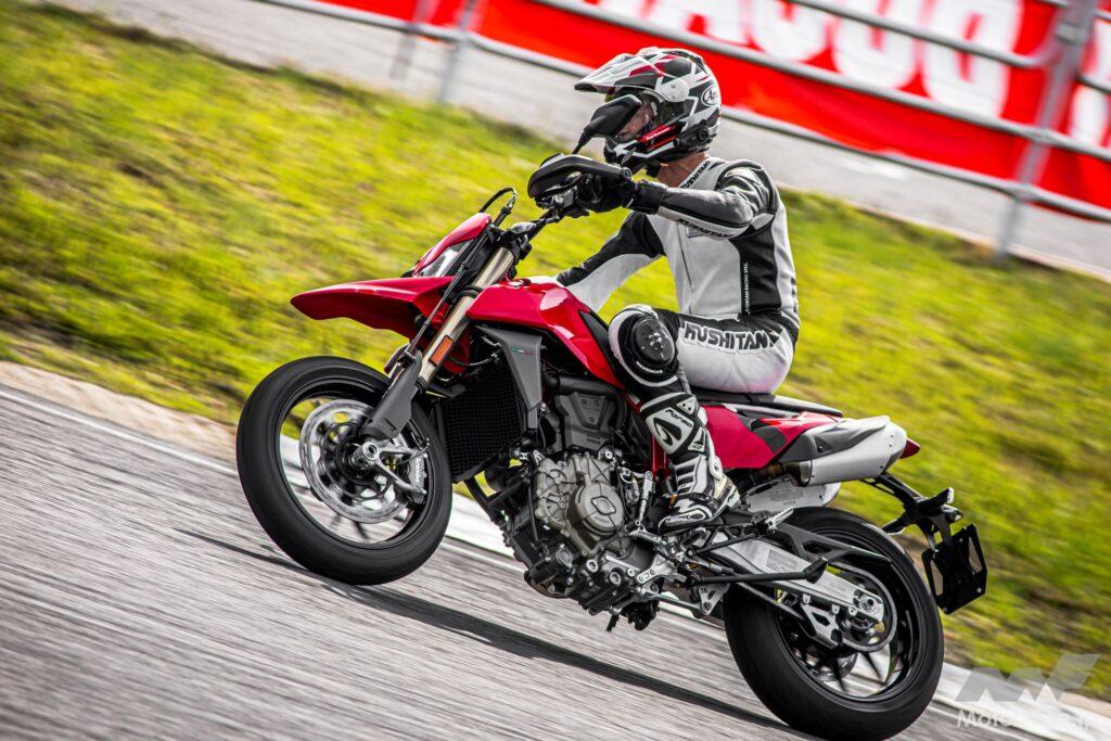ハンドリングは、漫然と流しているとロール方向には軽快だが、セルフステアの成分が少なく、慌てて車体を深く寝かせてもあまり曲がってくれない。一方、フロントブレーキで積極的にフォークを縮めてコーナーに進入すると、鋭く向きを変えてくれる。この車体のピッチングを生かして旋回力を引き出すというハンドリングは、まさにスーパーモトのそれであり、サーキットのようなクローズドコースでこそ真価を発揮する。