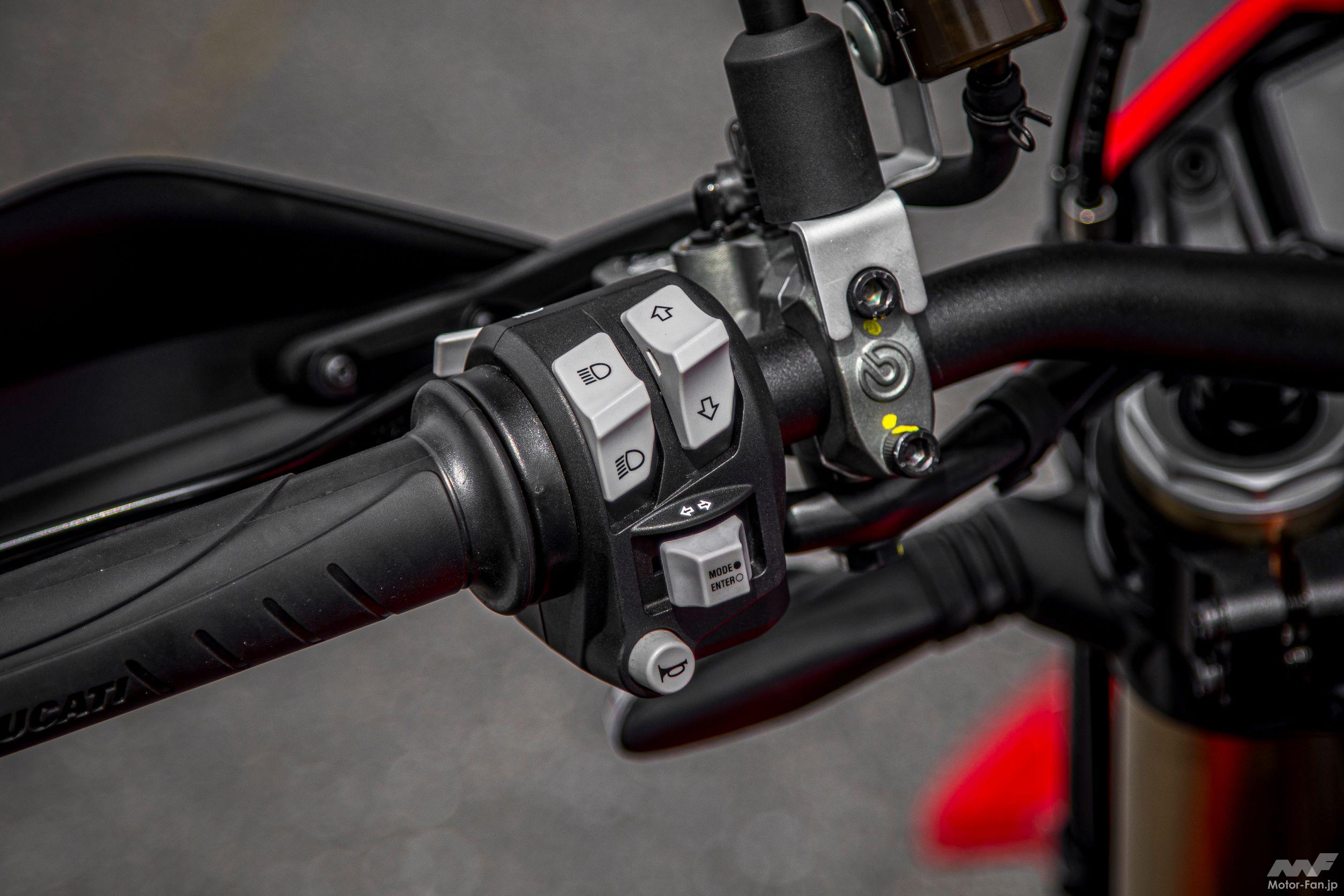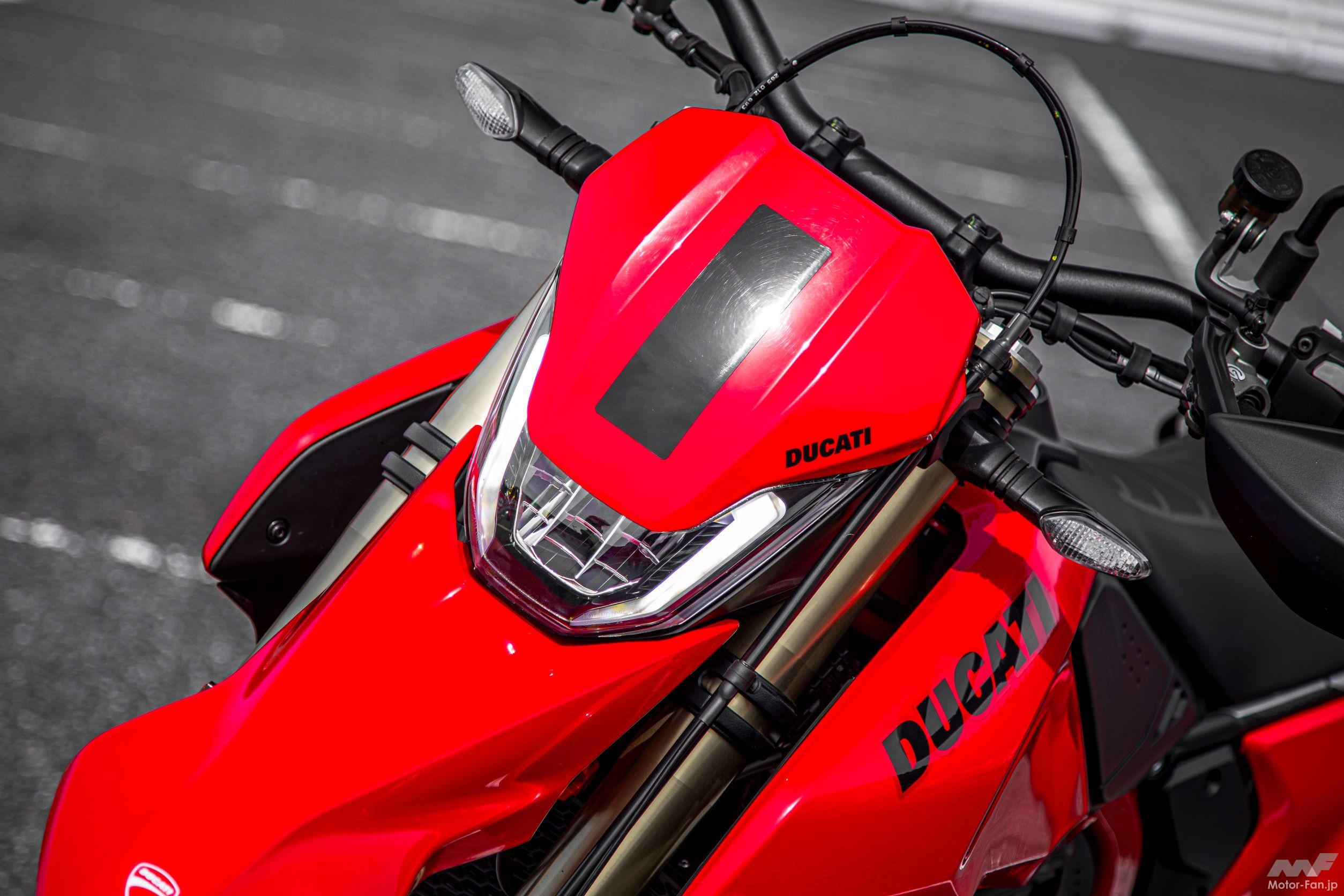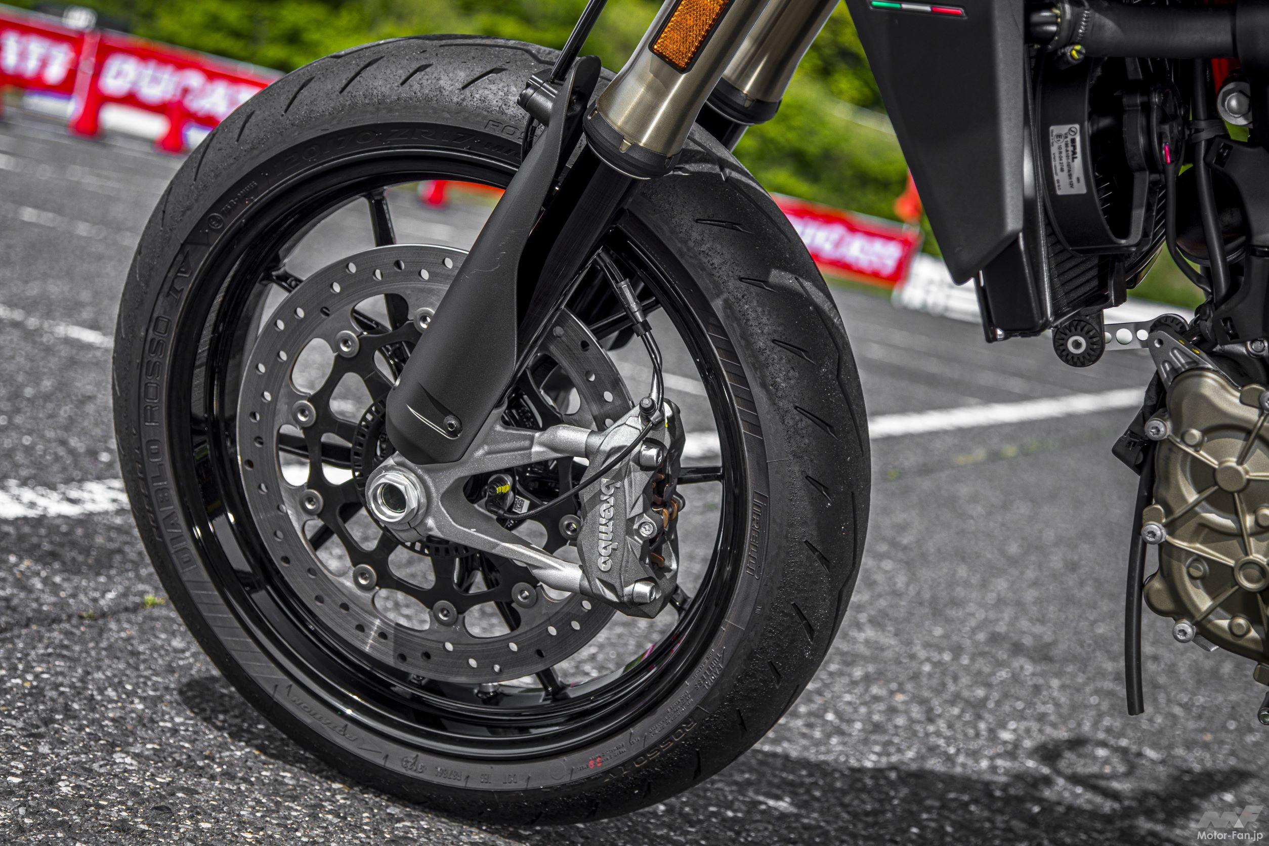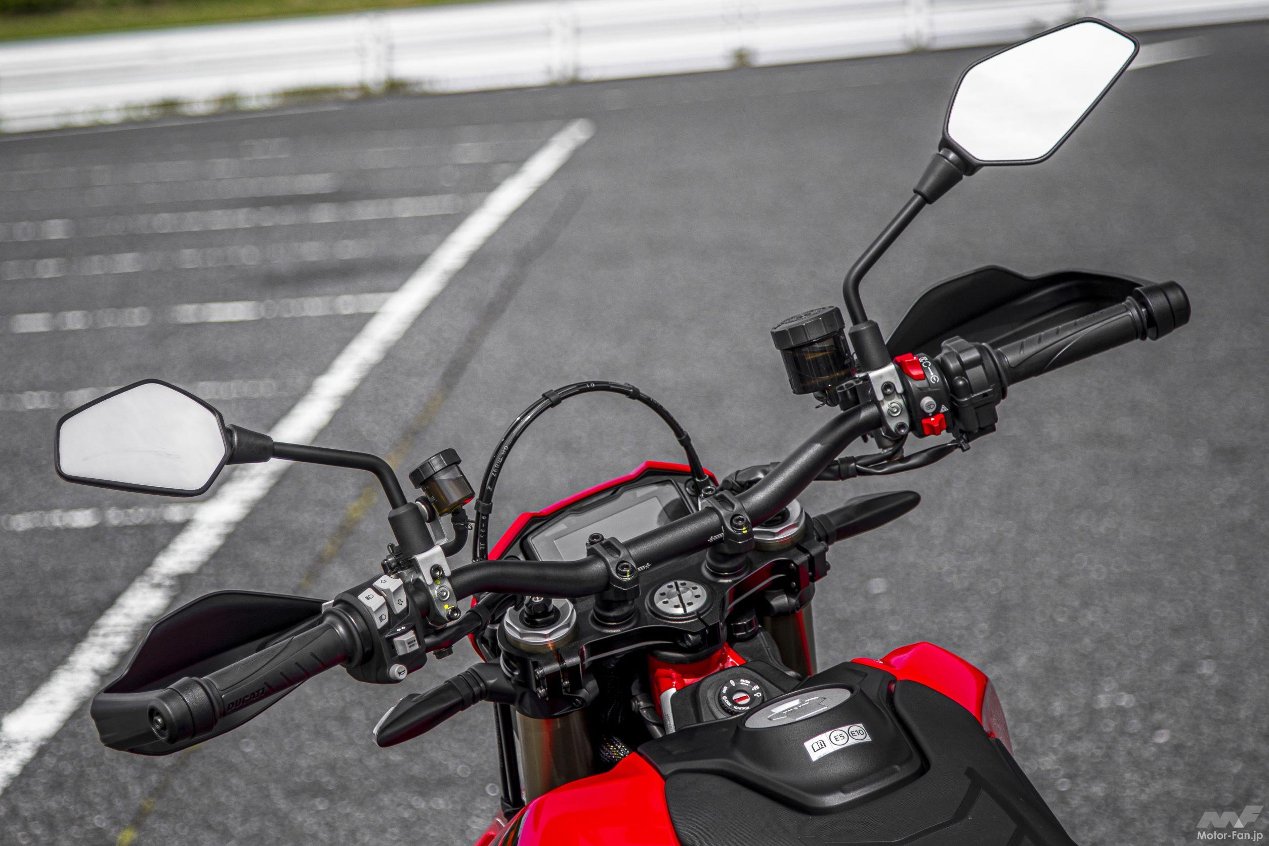 このハイパーモタード698モノ、とにかく軽さが際立っている。ガソリンなしでの公称車重は151kg。燃料タンク容量が12ℓなので、満タンなら単純計算でおよそ160kgに。MT-07より24kgも軽く、サイドスタンドから起こした瞬間に「軽っ!」と、思わず声に出してしまった。
