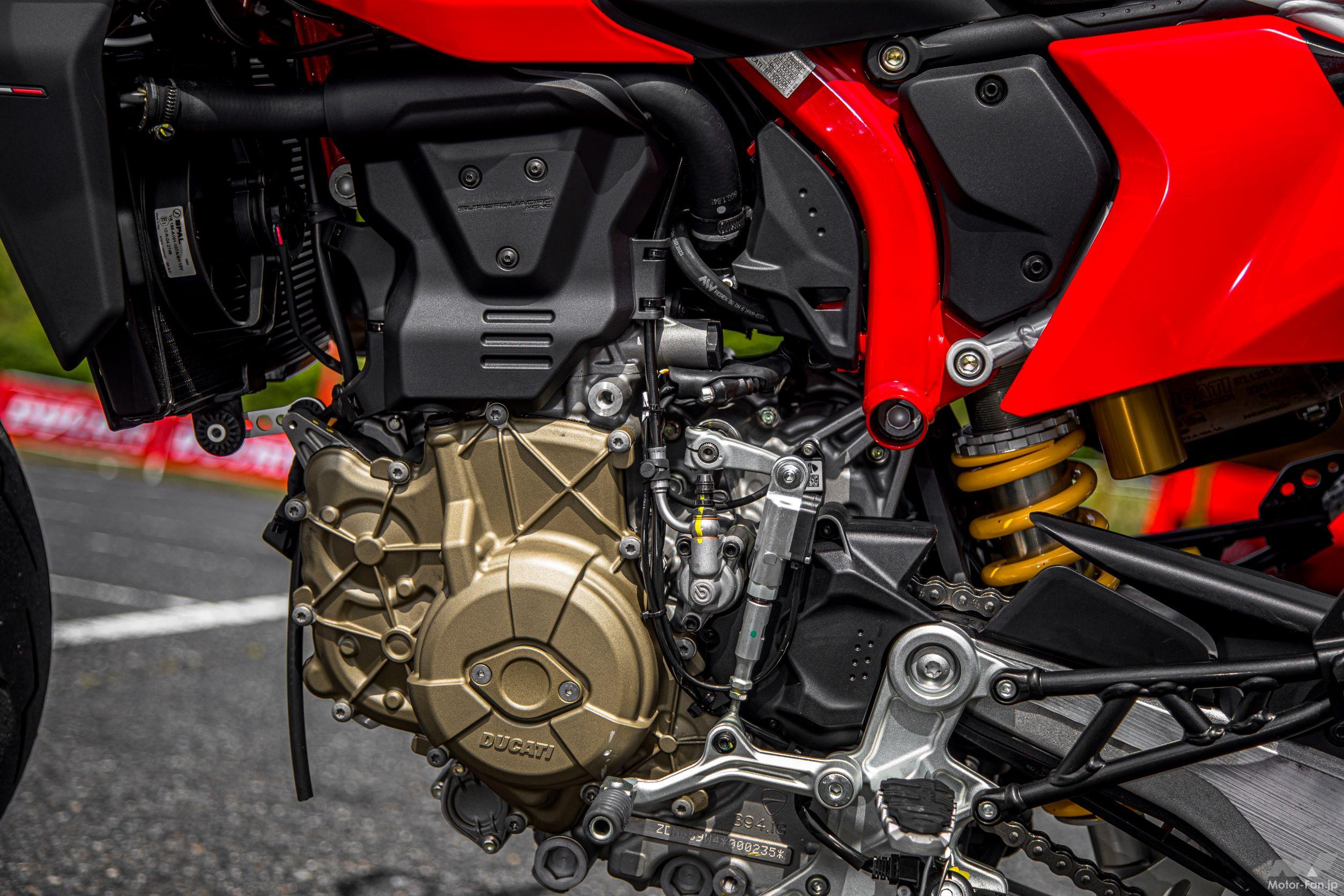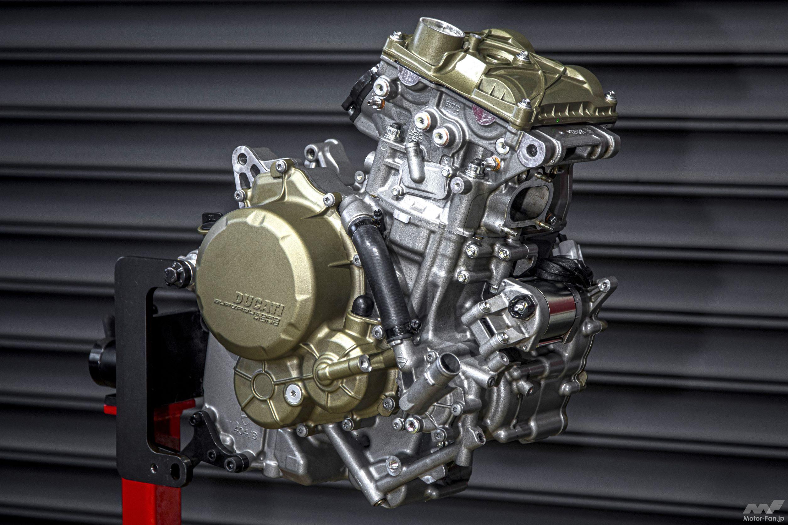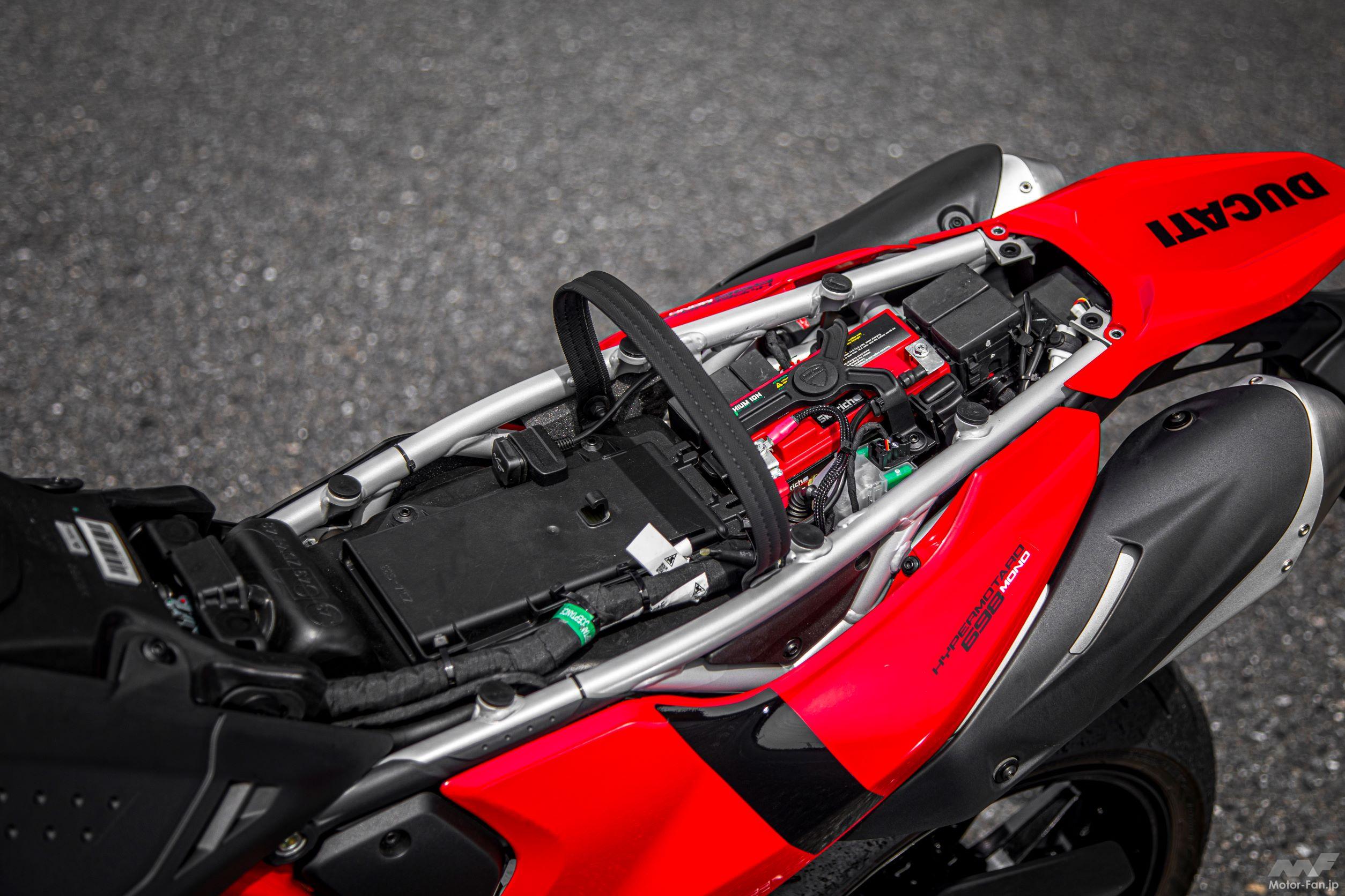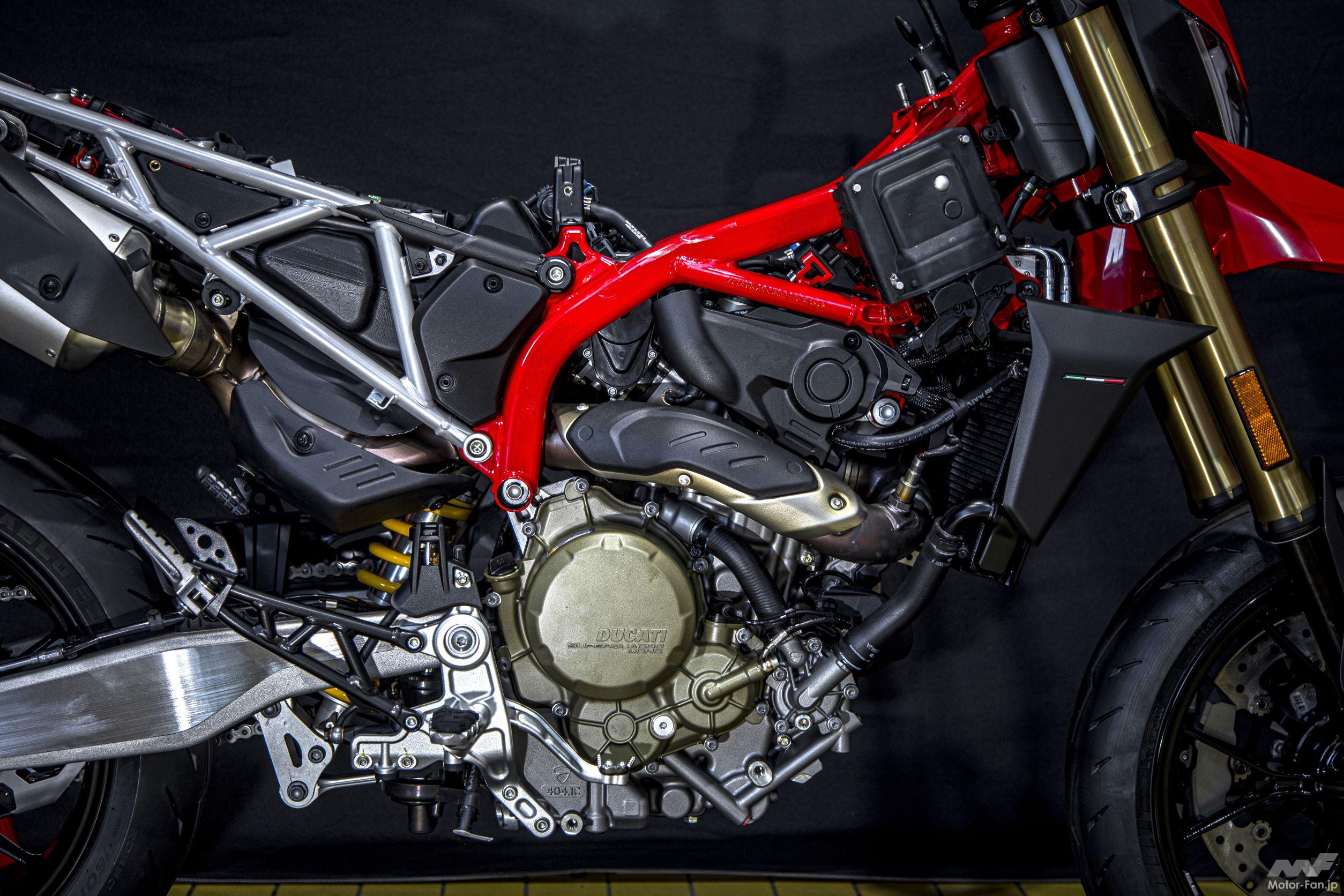 まずはエンジンから。ドゥカティからおよそ30年ぶりに登場した659ccの水冷単気筒は、ボア×ストロークがφ116mm×62.4mmで、このボアスト比(0.538)はMotoGPマシンよりもショートストローク設定なのだ。最高出力は77.5psで、近しい排気量のヤマハ・MT-07(688cc、水冷並列2気筒)が73psを発生することから、このクラスとしては特別にパワフルというわけではない。