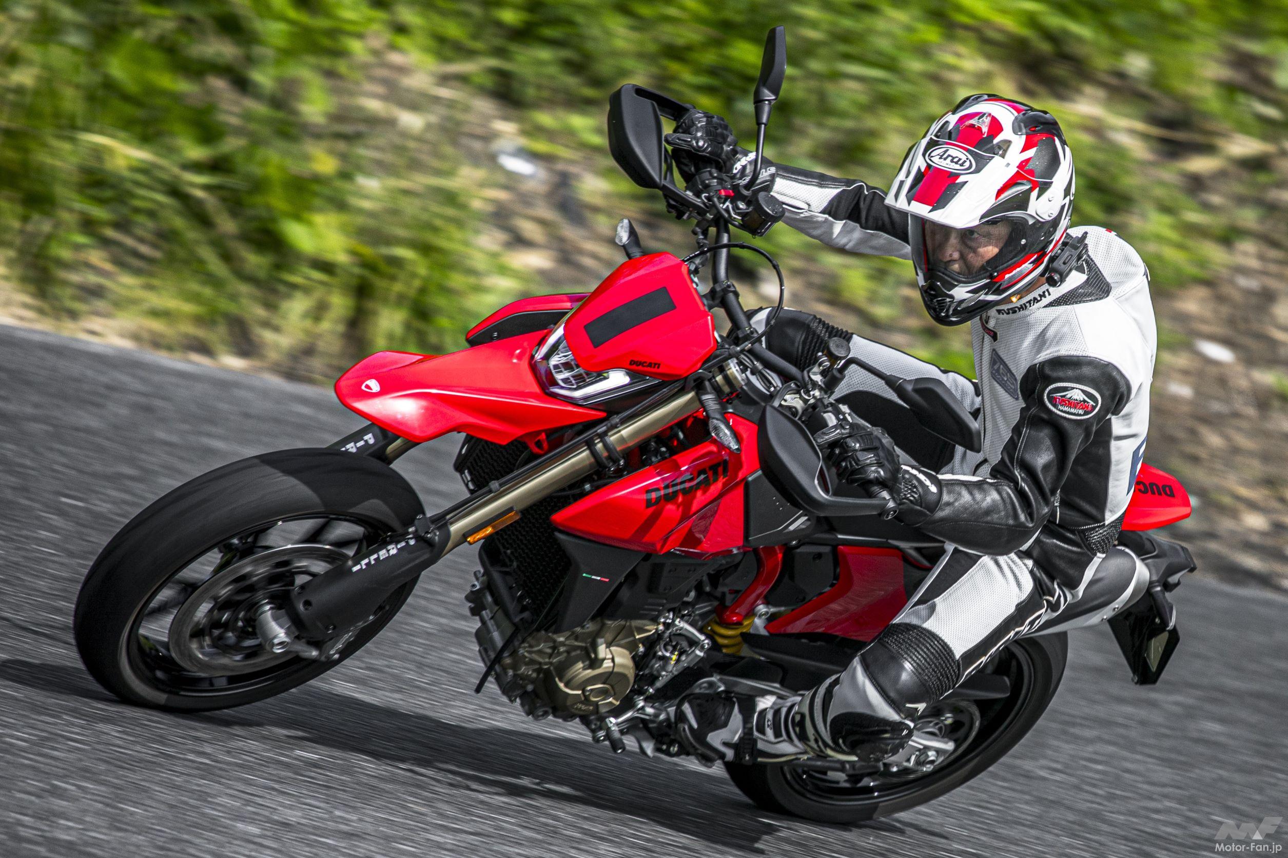ハンドリングは、漫然と流しているとロール方向には軽快だが、セルフステアの成分が少なく、慌てて車体を深く寝かせてもあまり曲がってくれない。一方、フロントブレーキで積極的にフォークを縮めてコーナーに進入すると、鋭く向きを変えてくれる。この車体のピッチングを生かして旋回力を引き出すというハンドリングは、まさにスーパーモトのそれであり、サーキットのようなクローズドコースでこそ真価を発揮する。