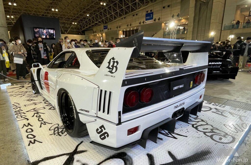 ブースのセンターに展示されていたのは「フェラーリ F40」だ。ホワイトのボディに日の丸がカラーリングされたF40は、得意のワークスフェンダーでワイド化され迫力のスタイルとなっている。もともとは赤のカラーリングだったものをオートサロンにあわせて急遽ラッピングで白のカラーリングに変更したという。ワイド化されたフェンダーはフロントは30mm、リヤは50mm拡幅。サスペンションは車高調で地面スレスレまで下げられていて、まるでレーシングカーのようだ。