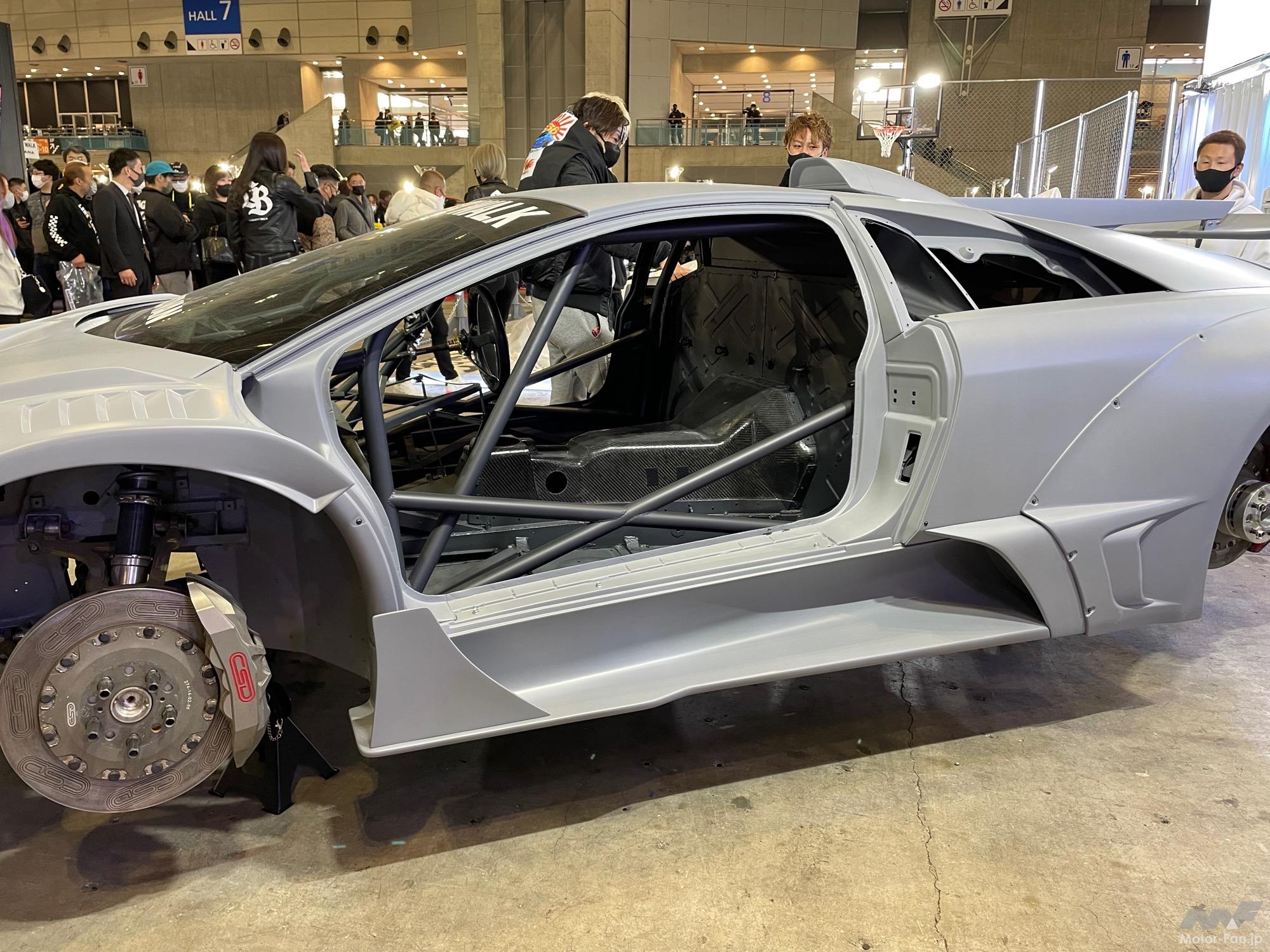 こちらはムルシエラゴ用新型ボディキットの原型。ベースとなっているのは、以前、同社がD1GPに参戦するドリフトマシンとして制作したランボルギーニ・ムルシエラゴだという。そのマシンのボディを使用して新たなムルシエラゴ用ボディキットの原型制作の過程を展示している。もはや以前の面影がないほどの造形力だ。ボディキットの価格は480万840円。