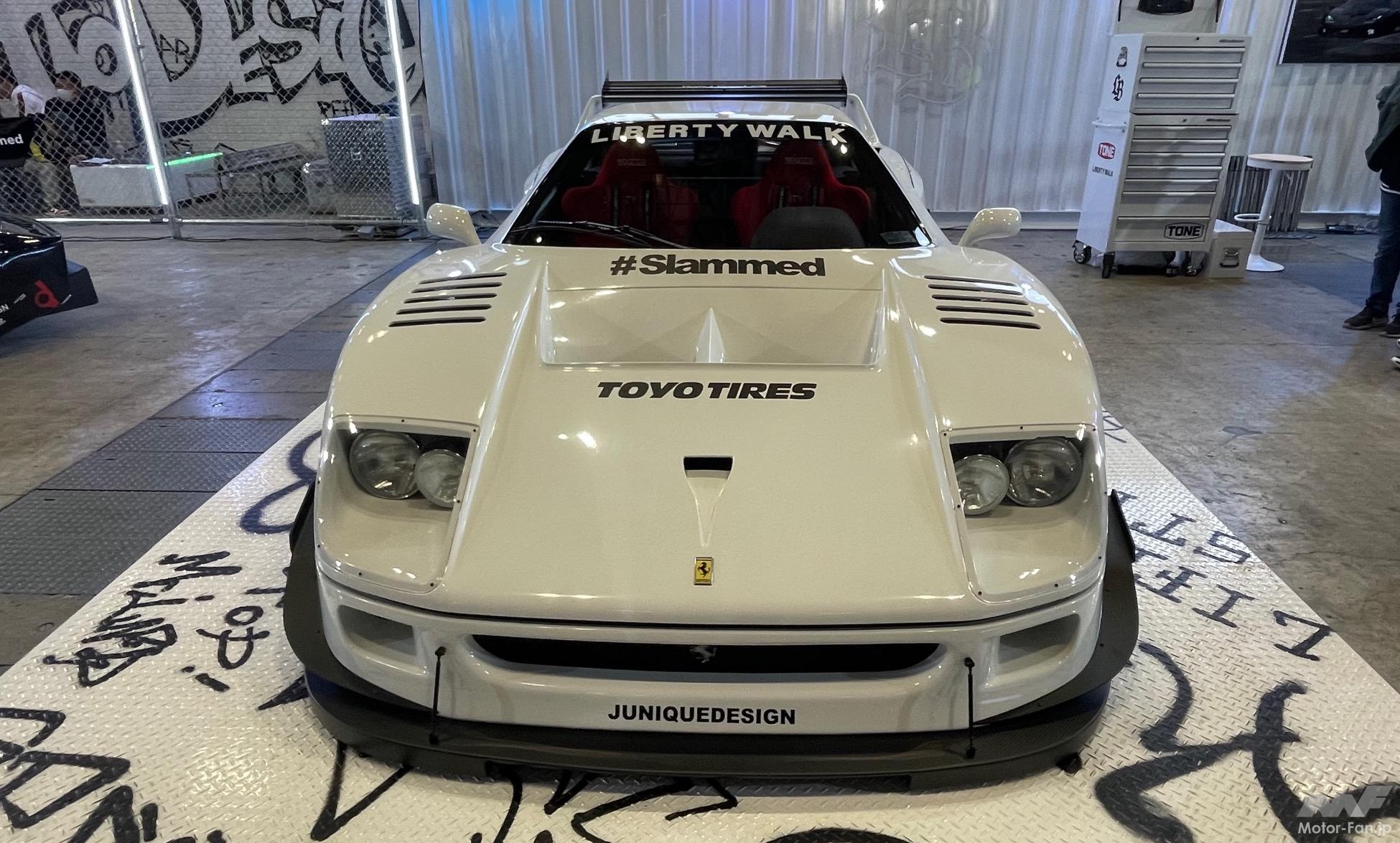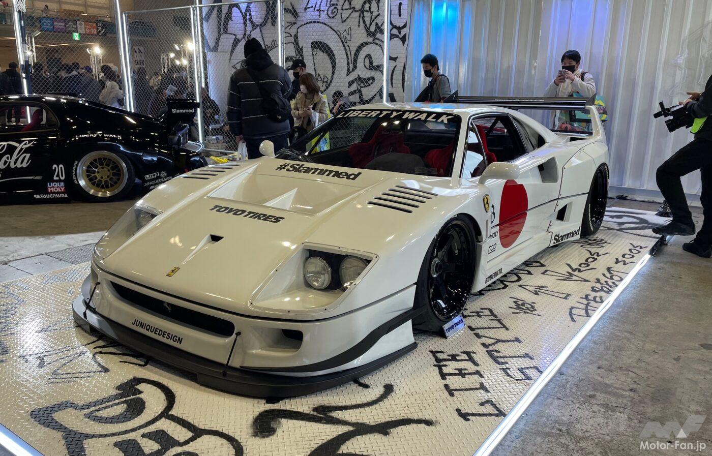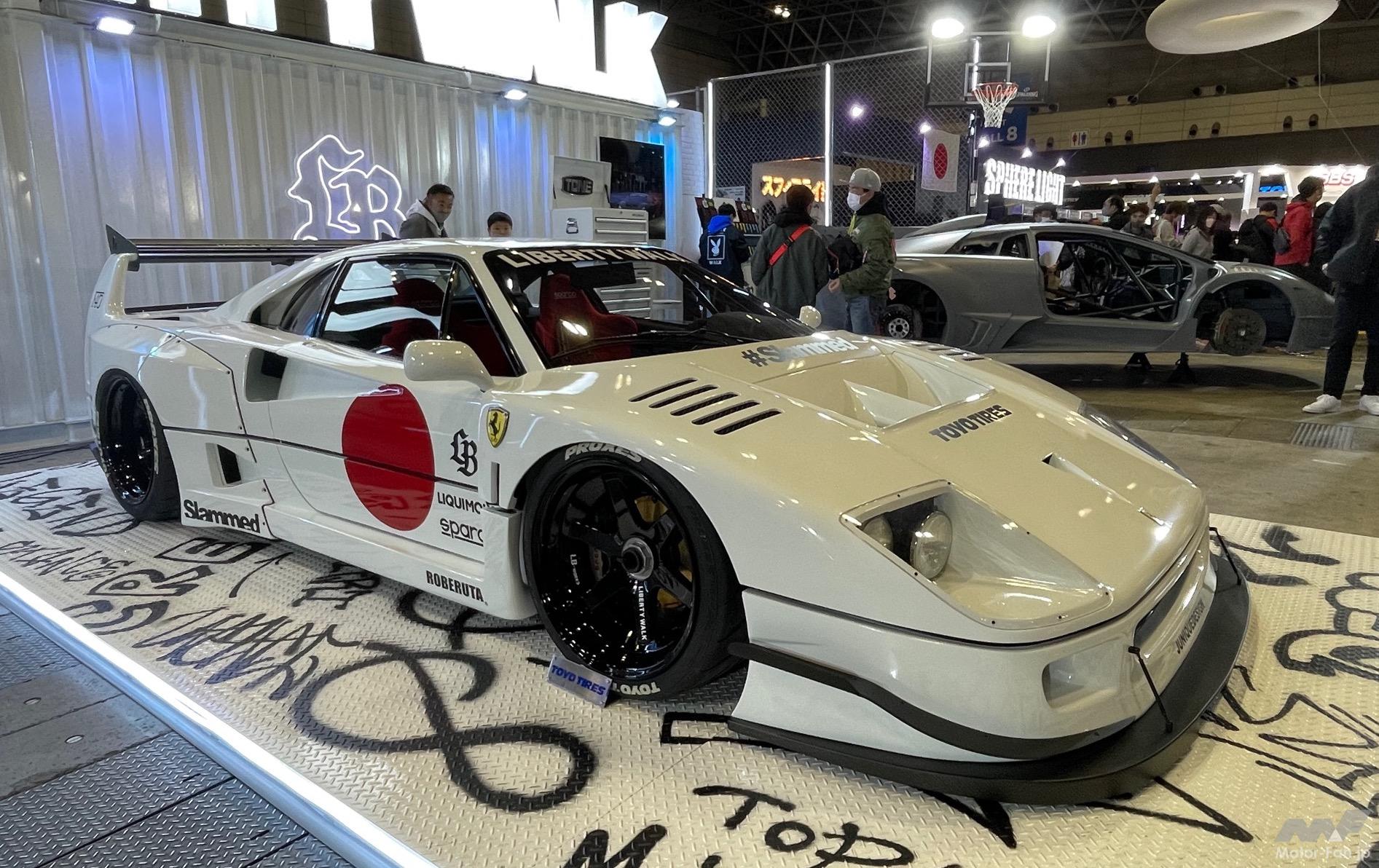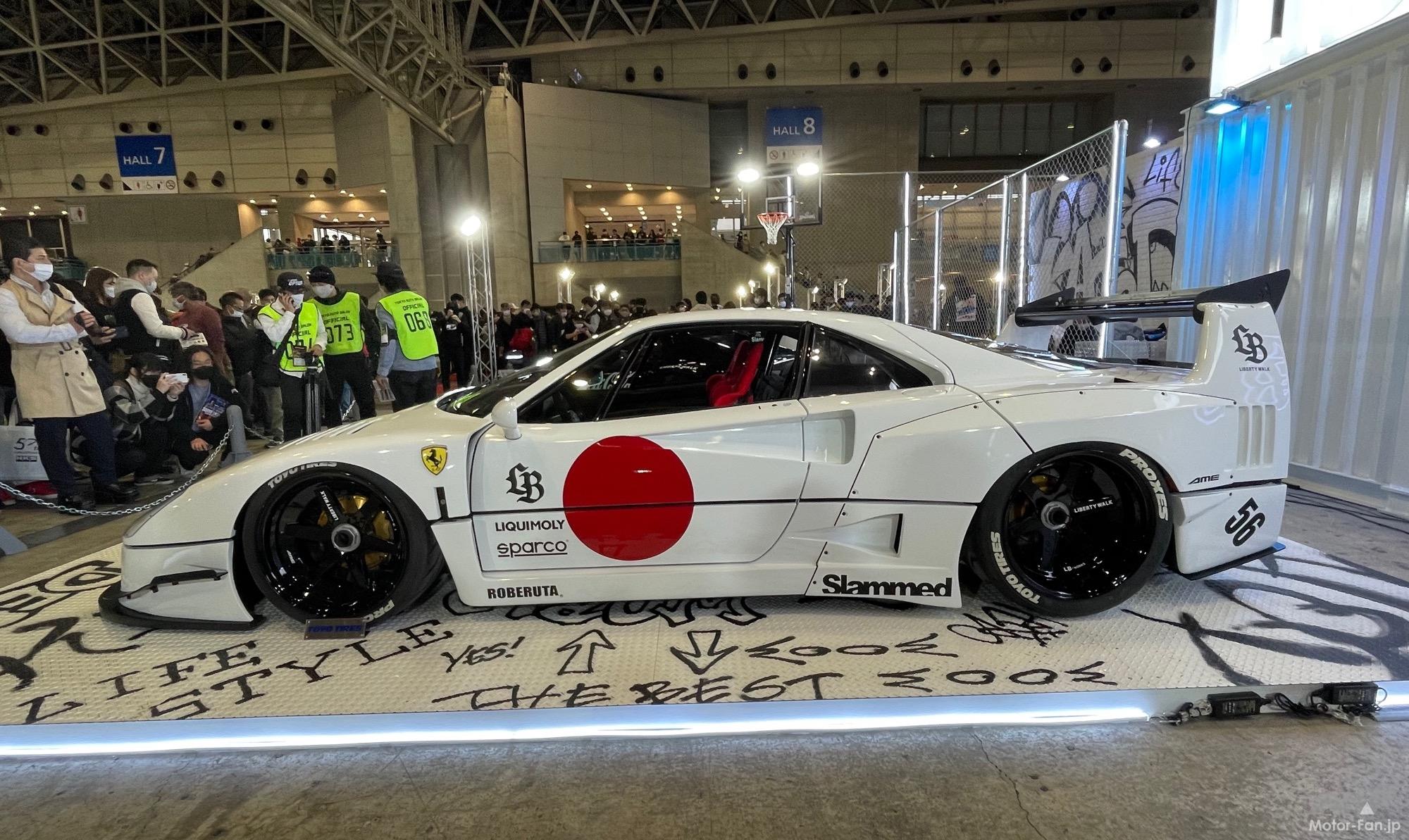 ブースのセンターに展示されていたのは「フェラーリ F40」だ。ホワイトのボディに日の丸がカラーリングされたF40は、得意のワークスフェンダーでワイド化され迫力のスタイルとなっている。もともとは赤のカラーリングだったものをオートサロンにあわせて急遽ラッピングで白のカラーリングに変更したという。ワイド化されたフェンダーはフロントは30mm、リヤは50mm拡幅。サスペンションは車高調で地面スレスレまで下げられていて、まるでレーシングカーのようだ。