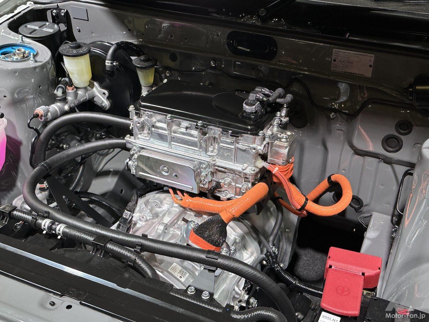AE86レビンBEV Conceptは、4A-GEU型エンジンを下ろしてBEV化している。使っているのは、トヨタが既存で使っているユニットだ。モーターは、北米タンドラのハイブリッド用モーターを移植。リヤに搭載するバッテリーはプリウスPHVのものを使う。プリウスPHVのバッテリーは8.8kWhだ。