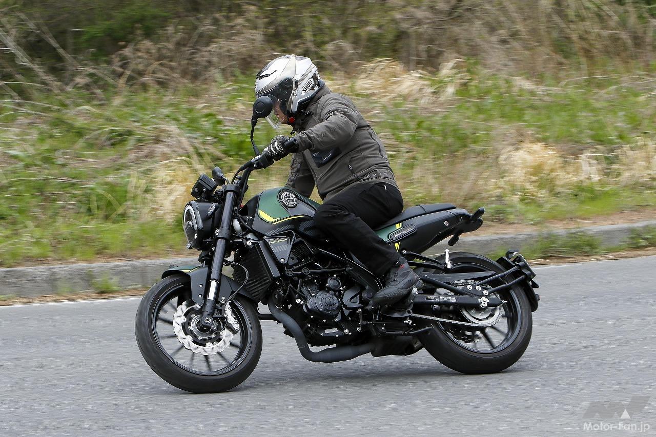 始動すると、ダウンマフラーから力強く小気味良いサウンドが放たれます。発進して排気音を高めながら加速させると、エンジンはストレスなく高回転へと上昇していきます。とはいっても強烈な加速性を発揮するわけじゃありません。全体にフラットな特性のエンジンは、あくまでもスムーズなレスポンスで、どの回転域からでもアクセルに素直に追従します。CLも似たようなパワーフィーリングですが、吹け上がりはレオンチーノのほうが軽やかだと感じます。 250㏄シングルエンジンは一般道を走るうえでとくにパワー不足を感じることはありません。発進加速で車に後れを取ることはありませんし、120㎞/hでの高速道路巡航も十分にこなしてくれます。ただし微振動はグリップを通して伝わってくるので、長時間の高速走行では不快に感じるかもしれません。でも、それによって疲労が増幅することはないと思いますので、ツーリングの相棒として乗るにも手ごろなバイクじゃないかと感じます。