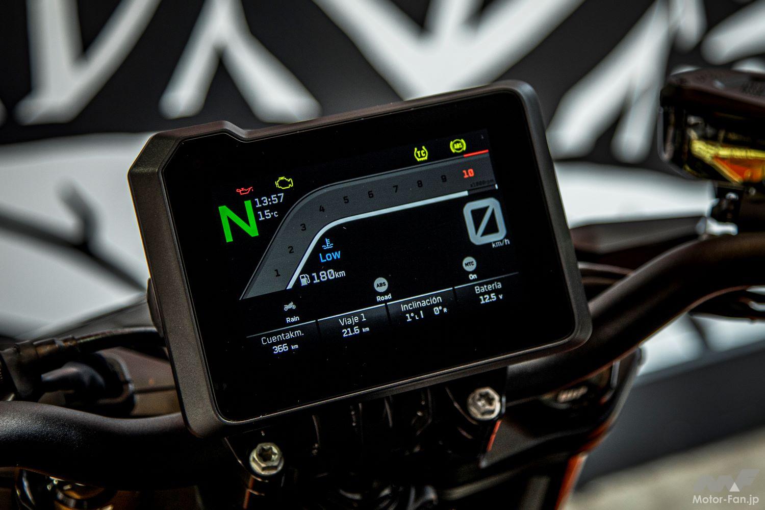 形状、表示、搭載位置など1390とほぼ同じのカラーメーターは5インチのTFT。スマホとコネクトして音楽を聴いたり通話したりできるKTMコネクトもオプションで設定。なおトラックモードなどのオプションは新車から最初の1500kmまでは全部搭載されており、1500km走った時点で自動的にロックがかかる。そこまでの走行でそれらオプションが自分のライディングスタイルに必要だと思えば、ディーラーでオプション料金を支払いロックを外してもらえるという設定だ。