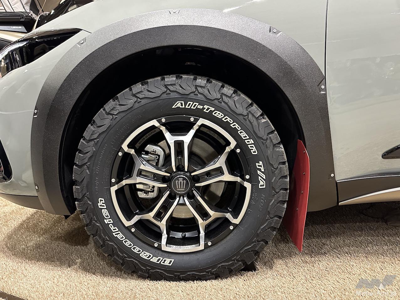 タイヤ&ホイールは、BFグッドリッチの265/60R18 オールテレインタイヤ+18インチ/7.5Jホイールを履く。オリジナルは、225/45R21を履いていた。外径は