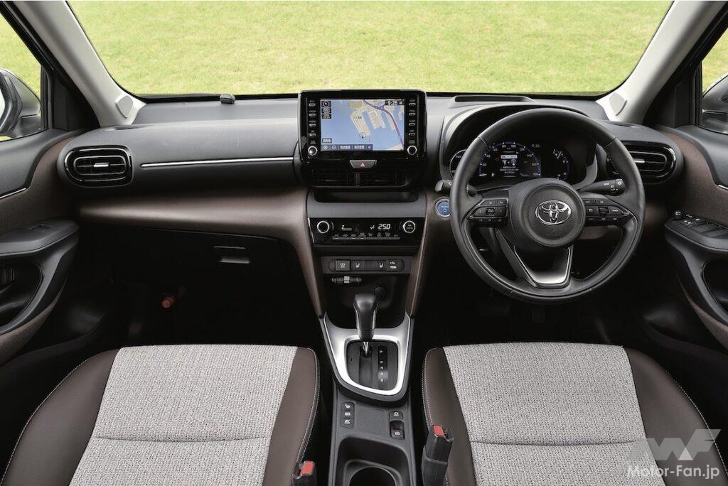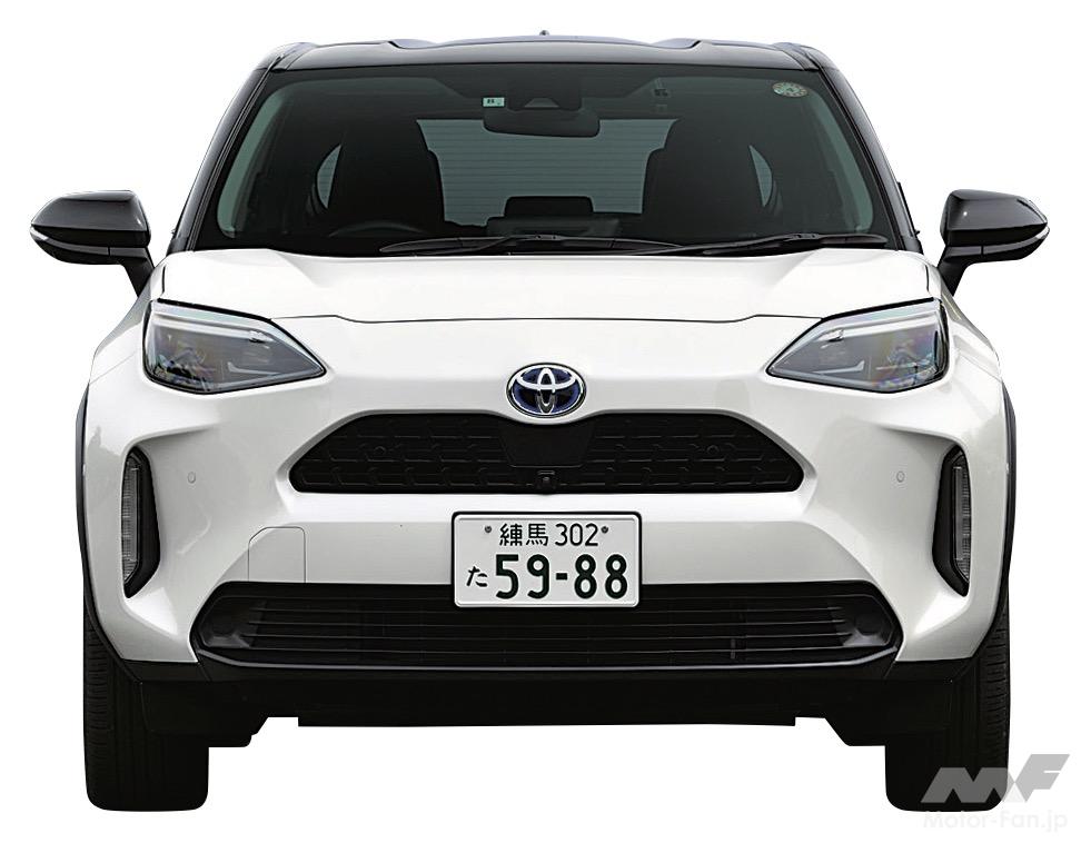 2021年度の新車登録販売台数ナンバー1に輝いたヤリス。それに大きく貢献したのが、ヤリス全体の約半分を占めるヤリスクロスである。プラットフォームこそヤリスと共有しているが、スリーサイズは全長4180mm×全幅1765mm×全高1590mmと、ヤリスより240mm長く、70mm幅広く、90mm背が高い。